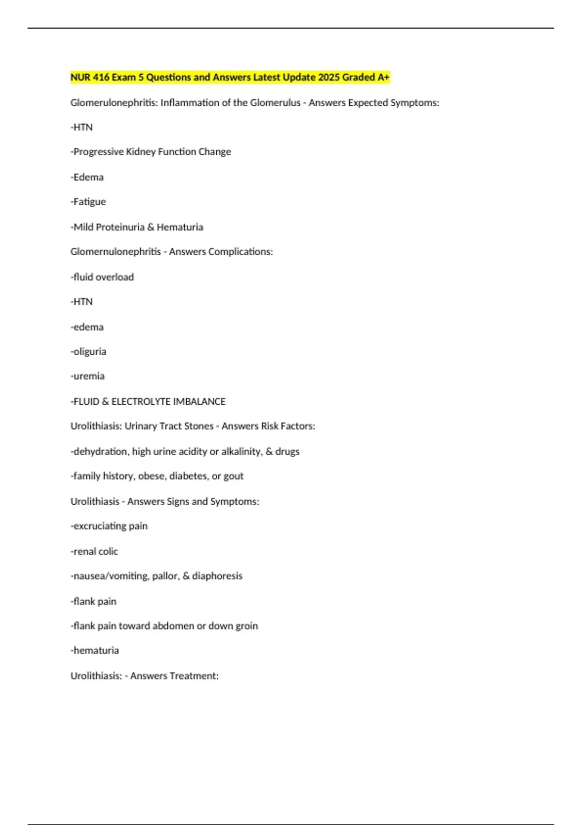 NUR 416 Exam 5 Questions and Answers Latest Update 2025 Graded A+ Glomerulonephritis: Inflammation of the Glomerulus - Answers Expected Symptoms: -HTN -Progressive Kidney Function Change -Edema -Fatigue -Mild Proteinuria & Hematuria Glomernulonephritis - Answers Complications: -fluid overload -HTN -edema -oliguria -uremia -FLUID & ELECTROLYTE IMBALANCE Urolithiasis: Urinary Tract Stones - Answers Risk Factors: -dehydration, high urine acidity or alkalinity, & drugs -family history, obese, diabetes, or gout Urolithiasis - Answers Signs and Symptoms: -excruciating pain -renal colic -nausea/vomiting, pallor, & diaphoresis -flank pain -flank pain toward abdomen or down groin -hematuria Urolithiasis: - Answers Treatment: -opioids & NSAIDs -spasmolytic drugs -thiazide diuretic & allopurinol -lithotripsy -antibiotics Urolithiasis: - Answers Plan of Care: -increase fluid intake -drugs -walking -maintain nutrition Urolithiasis: - Answers Diet: -calcium oxalate type: avoid oxalate: spinach, black tea, rhubarb -calcium phosphate type: limit animal proteins, dairy -struvite type: limit high phosphate foods: dairy, organ meats, whole grains -uric acid type: decrease purine: organ meats, poultry, fish, gravies, red wines, sardines -cystine: limit animal protein, increase oral fluids If patient has ESWL (lithotripsy) what should be expected vs reported to provider? - Answers Expected: -extensive bruising -blood in urine Reported: -pain -fever -chills -dysuria Purpose: -to break up stones Education: -encourage fluids -strain urine -send stones to lab to determine cause BUN/Creatinine elevated at the same time - Answers kidney impairment BUN elevated without creatinine - Answers dehydration The higher the specific gravity - Answers the more dehydrated the client osmolarity - Answers increases with dehydration