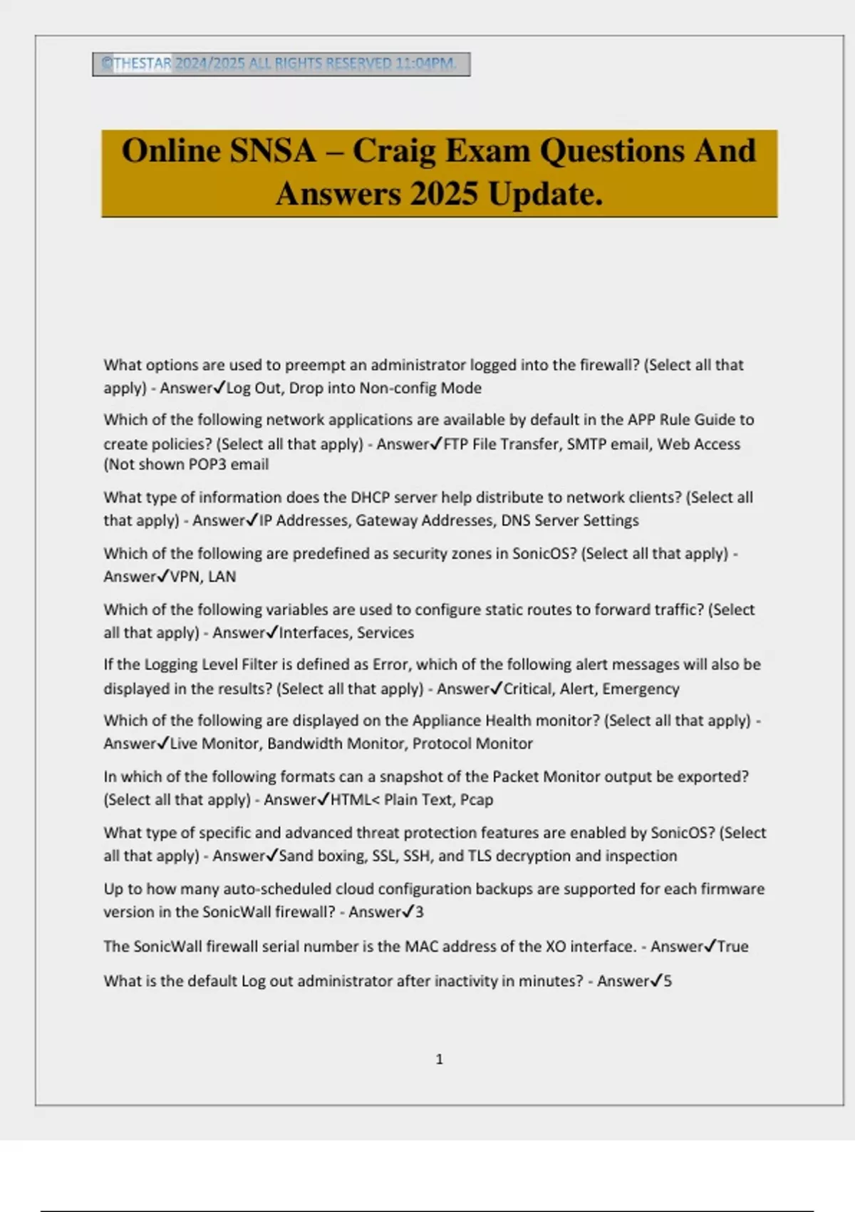 ©THESTAR 2024/2025 ALL RIGHTS RESERVED 11:04PM. 1 Online SNSA – Craig Exam Questions And Answers 2025 Update. What options are used to preempt an administrator logged into the firewall? (Select all that apply) - AnswerLog Out, Drop into Non-config Mode Which of the following network applications are available by default in the APP Rule Guide to create policies? (Select all that apply) - AnswerFTP File Transfer, SMTP email, Web Access (Not shown POP3 email What type of information does the DHCP server help distribute to network clients? (Select all that apply) - AnswerIP Addresses, Gateway Addresses, DNS Server Settings Which of the following are predefined as security zones in SonicOS? (Select all that apply) - AnswerVPN, LAN Which of the following variables are used to configure static routes to forward traffic? (Select all that apply) - AnswerInterfaces, Services If the Logging Level Filter is defined as Error, which of the following alert messages will also be displayed in the results? (Select all that apply) - AnswerCritical, Alert, Emergency Which of the following are displayed on the Appliance Health monitor? (Select all that apply) - AnswerLive Monitor, Bandwidth Monitor, Protocol Monitor In which of the following formats can a snapshot of the Packet Monitor output be exported? (Select all that apply) - AnswerHTML< Plain Text, Pcap What type of specific and advanced threat protection features are enabled by SonicOS? (Select all that apply) - AnswerSand boxing, SSL, SSH, and TLS decryption and inspection Up to how many auto-scheduled cloud configuration backups are supported for each firmware version in the SonicWall firewall? - Answer3 The SonicWall firewall serial number is the MAC address of the XO interface. - AnswerTrue What is the default Log out administrator after inactivity in minutes? - Answer5 ©THESTAR 2024/2025 ALL RIGHTS RESERVED 11:04PM. 2 What are the administrator privilege levels? - AnswerFull with access to Config Mode, Full with access to Non-Config Mode, Read Only, or Limited Which panel of the SonicOS management interface is used to define password restrictions? - AnswerManage>Appliance>Base Settings>Login Security The HTTP Web-based management option in SonicOS is disabled by default. - AnswerTrue SonicOS supports multiple versions of the TLS protocol. - AnswerTrue CAC (Common Access Card) support only on HTTPS connections. - AnswerTrue What is the default SSH port? - Answer22 SonicOS supports what SNMP versions? - Answer1, 2C, 3, and all relevant MIB 2 groups SonicWall firewalls can interoperate with any X509v3 certificates issued by third-party CA authorities. - AnswerTrue SonicWall can interoperate with what X509v3 3rd party CA authorities? - AnswerEntrust, Microsoft, Open CA, Open SSL, and Verisign What CA certificates can be imported? - AnswerPKCS#12 (.p12 ) or PKCS#7 (PEM or DER) Predefined schedules include: - AnswerWork Hours, After Hours, and Weekend Hours Edit Schedule type options include: - AnswerOnce, Recurring, and Mixed What guides are available on the SonicWall firewall? - AnswerSetup, Portshield Interface, Public Server, VPN, Wireless, App Rule, and WXA How many Virtual Access Points (VAPs) can be created? - Answer8 Which setting when enabled requires a strong password setting to avoid potential security vulnerabilities? - AnswerAllow HTTPS on this WAN Inteface (radio button) What is the default LAN Interface? - AnswerX0 What is the default WAN Interface? - AnswerX1 What is the SonicWall appliance default IP Address? - Answer192.168.168.168 What Public Server Types are available by default? - AnswerWeb, FTP, Mail, and Terminal Services What type of NAT policies does a Public Server wizard create? - AnswerInbound, Outbound, and Loopback NAT Policies What are the defaults for t