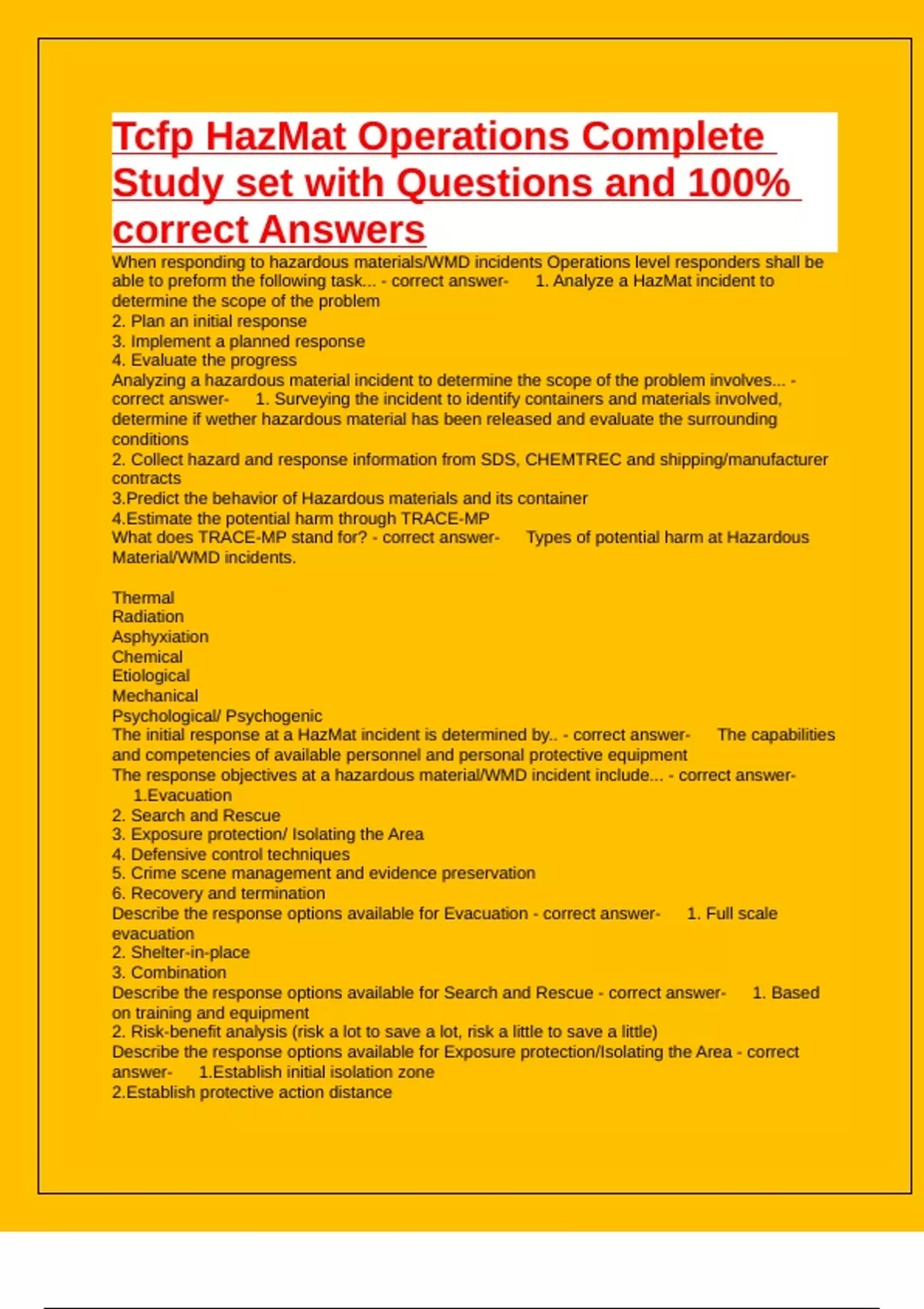 Tcfp HazMat Operations Complete Study set with Questions and 100% correct Answers