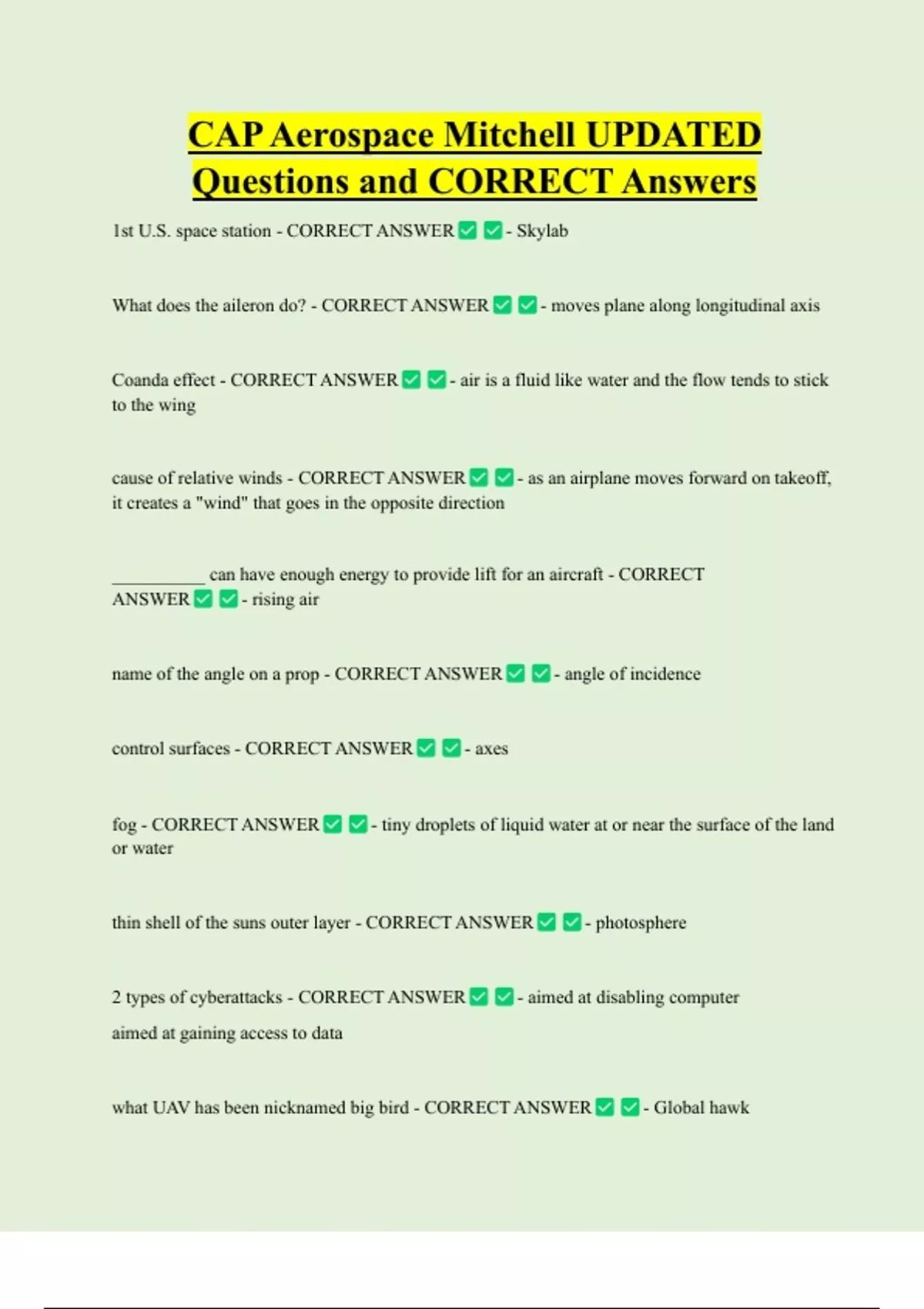 CAP Aerospace Mitchell UPDATED Questions and CORRECT Answers 1st U.S. space station - CORRECT ANSWER What does the aileron do? - CORRECT ANSWER Coanda effect - CORRECT ANSWER - Skylab - moves plane along longitudinal axis - air is a fluid like water and the flow tends to stick to the wing