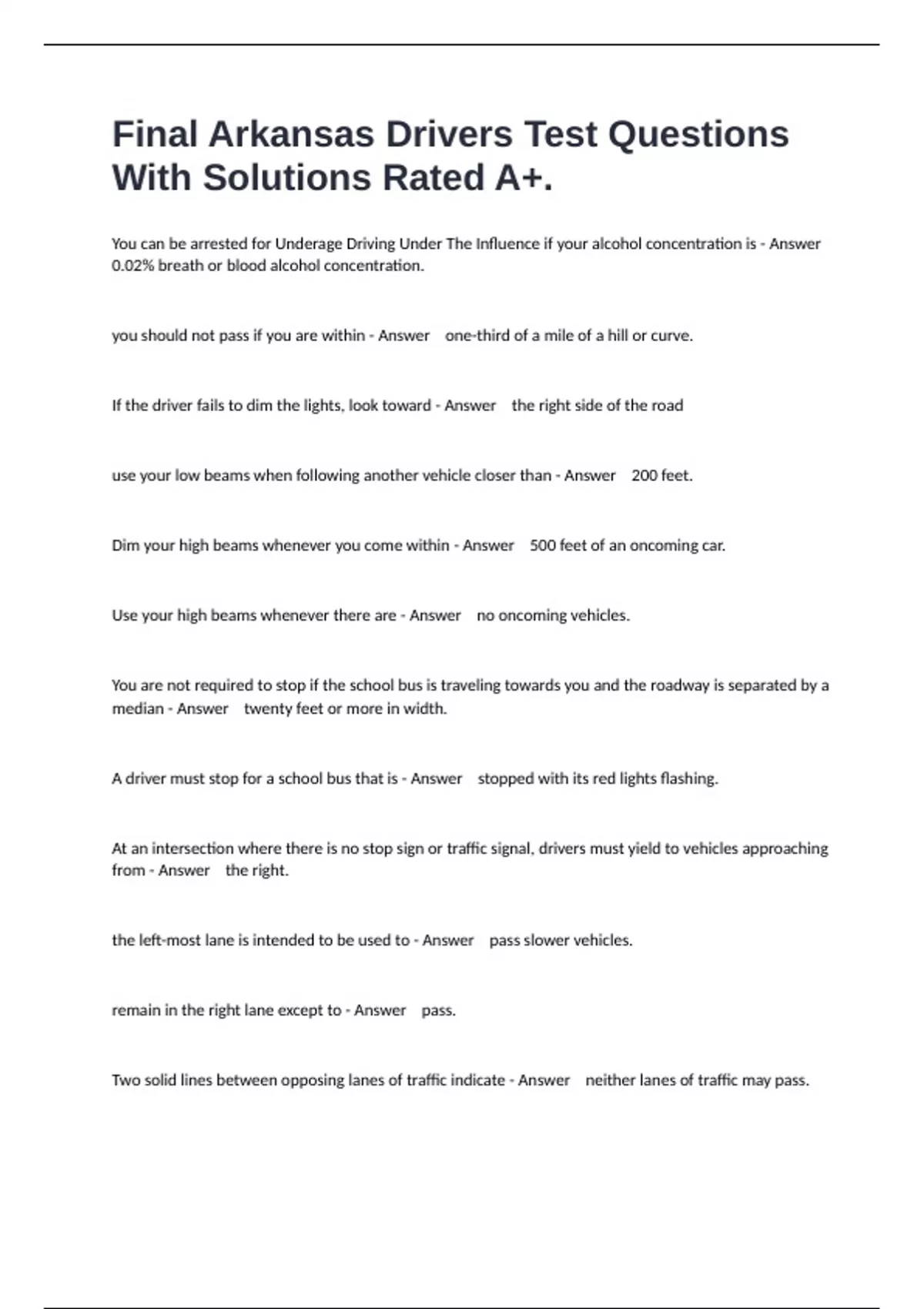 Final Arkansas Drivers Test Questions With Solutions Rated A+.