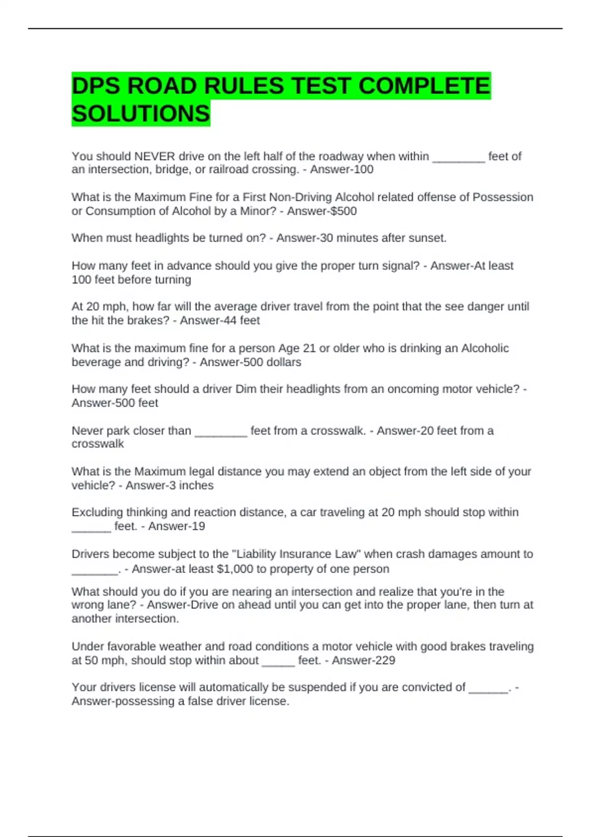 DPS ROAD RULES TEST COMPLETE SOLUTIONS
