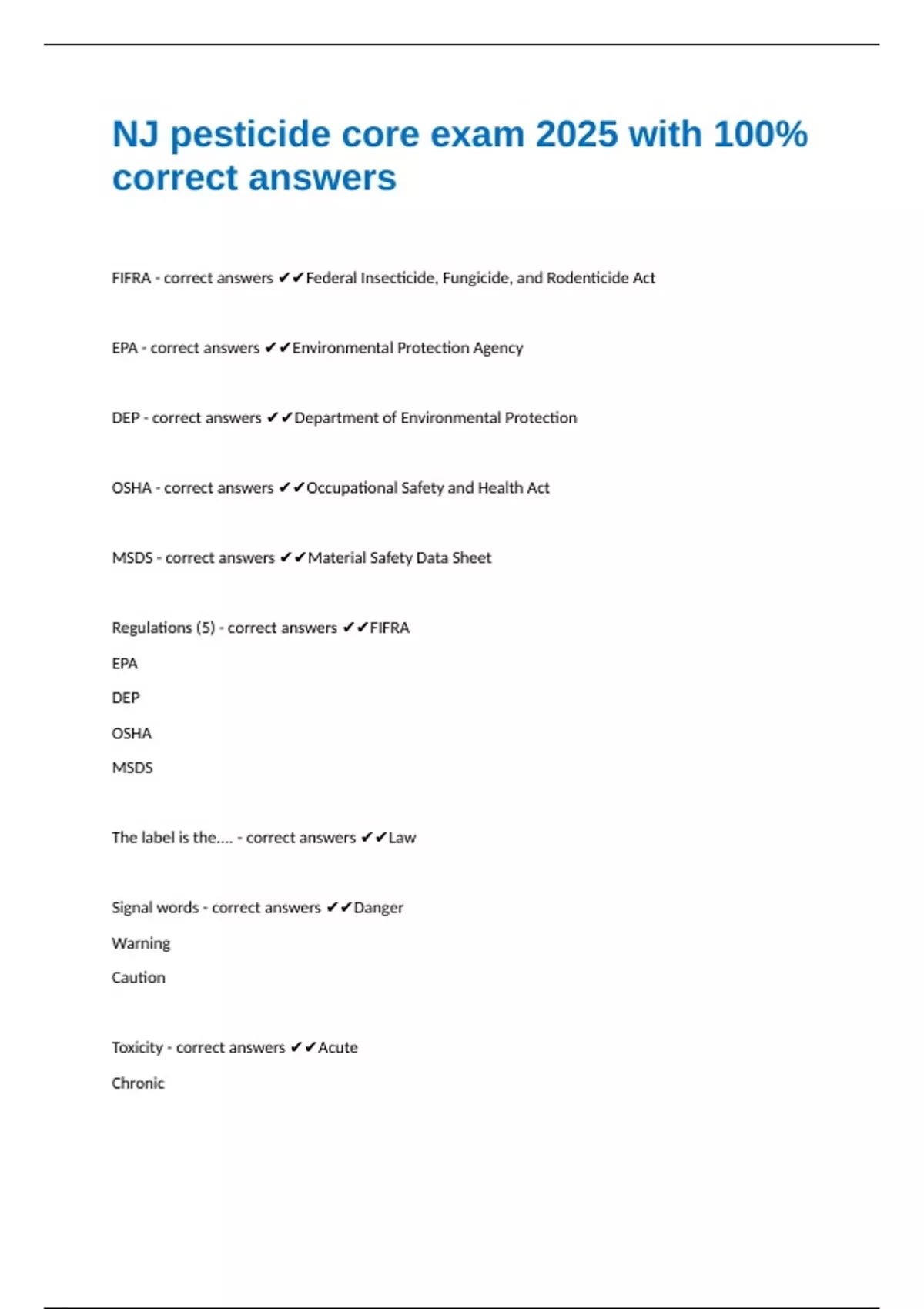 FIFRA - correct answers Federal Insecticide, Fungicide, and Rodenticide Act EPA - correct answers Environmental Protection Agency DEP - correct answers Department of Environmental Protection OSHA - correct answers Occupational Safety and Health Act MSDS - correct answers Material Safety Data Sheet Regulations (5) - correct answers FIFRA EPA DEP OSHA MSDS The label is the.... - correct answers Law Signal words - correct answers Danger Warning Caution Toxicity - correct answers Acute Chronic