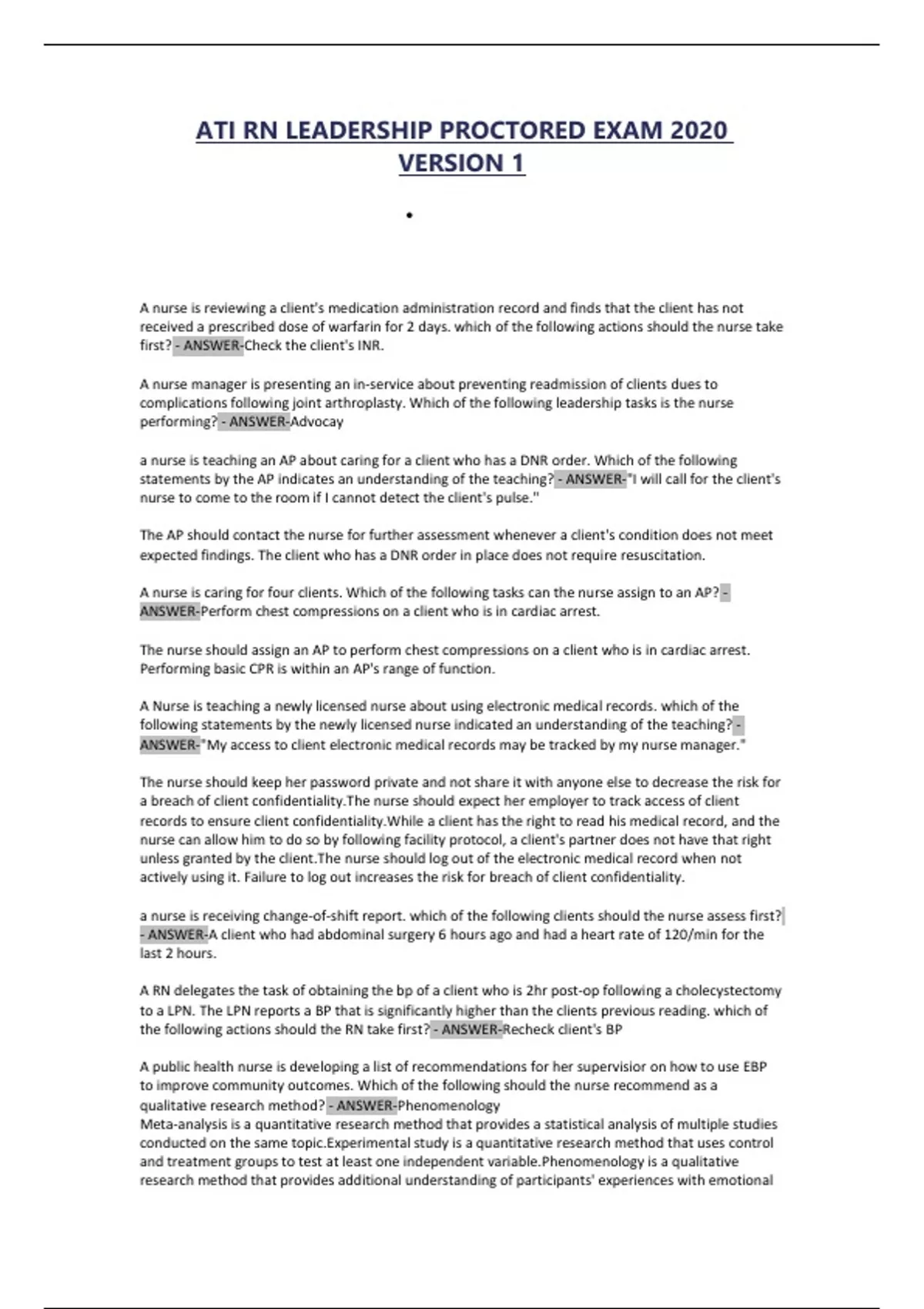 ATI RN LEADERSHIP PROCTORED EXAM 2020