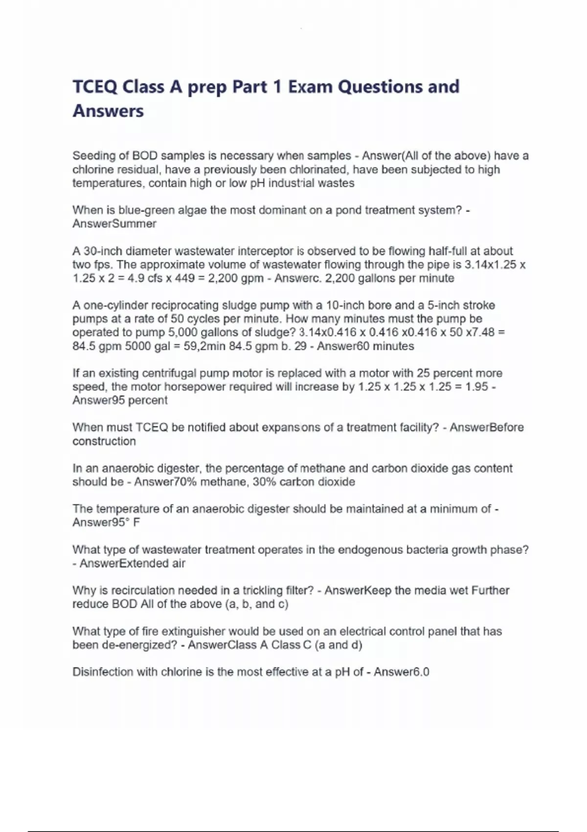 TCEQ Class A prep Part 1 Exam Questions and Answers Seeding of BOD samples is necessary when samples - Answer(All of the above) have a chlorine residual, have a previously been chlorinated, have been subjected to high temperatures, contain high or low pH industrial wastes When is blue-green algae the most dominant on a pond treatment system? - AnswerSummer A 30-inch diameter wastewater interceptor is observed to be flowing half-full at about two fps. The approximate volume of wastewater flowing through the pipe is 3.14x1.25 x 1.25 x 2 = 4.9 cfs x 449 = 2,200 gpm - Answerc. 2,200 gallons per minute A one-cylinder reciprocating sludge pump with a 10-inch bore and a 5-inch stroke pumps at a rate of 50 cycles per minute. How many minutes must the pump be operated to pump 5,000 gallons of sludge? 3.14x0.416 x 0.416 x0.416 x 50 x7.48 = 84.5 gpm 5000 gal = 59,2min 84.5 gpm b. 29 - Answer60 minutes If an existing centrifugal pump motor is replaced with a motor with 25 percent more speed, the motor horsepower required will increase by 1.25 x 1.25 x 1.25 = 1.95 - Answer95 percent When must TCEQ be notified about expansions of a treatment facility? - AnswerBefore construction In an anaerobic digester, the percentage of methane and carbon dioxide gas content should be - Answer70% methane, 30% carbon dioxide The temperature of an anaerobic digester should be maintained at a minimum of - Answer95° F What type of wastewater treatment operates in the endogenous bacteria growth phase? - AnswerExtended air Why is recirculation needed in a trickling filter? - AnswerKeep the media wet Further reduce BOD All of the above (a, b, and c) What type of fire extinguisher would be used on an electrical control panel that has been de-energized? - AnswerClass A Class C (a and d) Disinfection with chlorine is the most effective at a pH of - Answer6.0