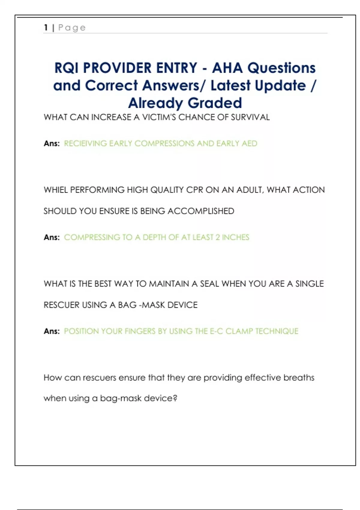 WHAT CAN INCREASE A VICTIM'S CHANCE OF SURVIVAL Ans: RECIEIVING EARLY COMPRESSIONS AND EARLY AED WHIEL PERFORMING HIGH QUALITY CPR ON AN ADULT, WHAT ACTION SHOULD YOU ENSURE IS BEING ACCOMPLISHED Ans: COMPRESSING TO A DEPTH OF AT LEAST 2 INCHES WHAT IS THE BEST WAY TO MAINTAIN A SEAL WHEN YOU ARE A SINGLE RESCUER USING A BAG -MASK DEVICE Ans: POSITION YOUR FINGERS BY USING THE E-C CLAMP TECHNIQUE How can rescuers ensure that they are providing effective breaths when using a bag-mask device?
