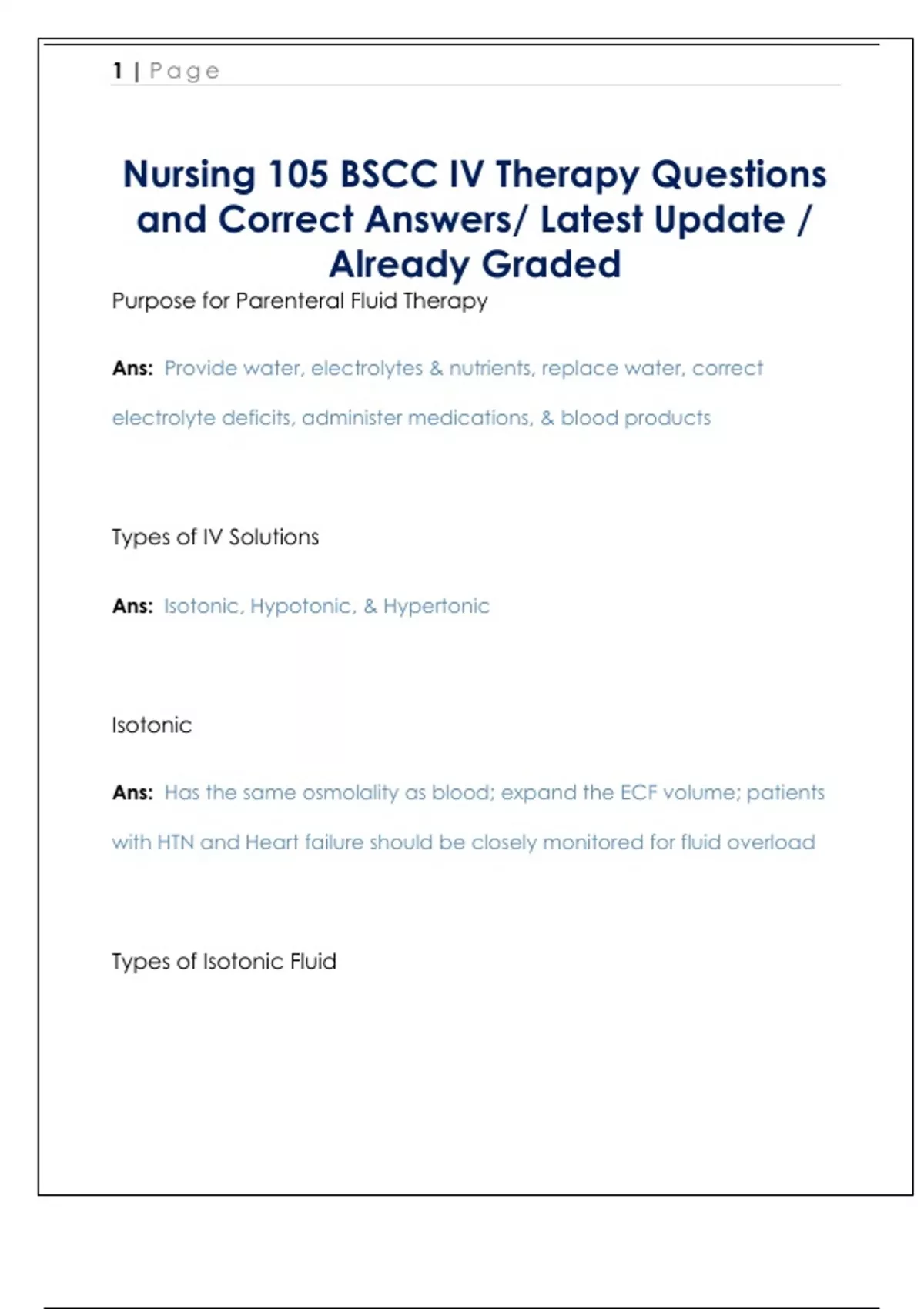 Purpose for Parenteral Fluid Therapy Ans: Provide water, electrolytes & nutrients, replace water, correct electrolyte deficits, administer medications, & blood products Types of IV Solutions Ans: Isotonic, Hypotonic, & Hypertonic Isotonic Ans: Has the same osmolality as blood; expand the ECF volume; patients with HTN and Heart failure should be closely monitored for fluid overload Types of Isotonic Fluid 2 | Page Ans: Dextrose 5% in Water, NS(0.9% NaCL),Dextrose 5% 1/4 NS, & LR or RL (Lactated Ringers- used to correct dehydration, sodium depletion, replace GI losses) Hypotonic Ans: Is < less than the osmolality of blood; Replaces cellular fluid and provides free water for excretion of body wastes; at times used to treat hypernatremia and other hyperosmolar co