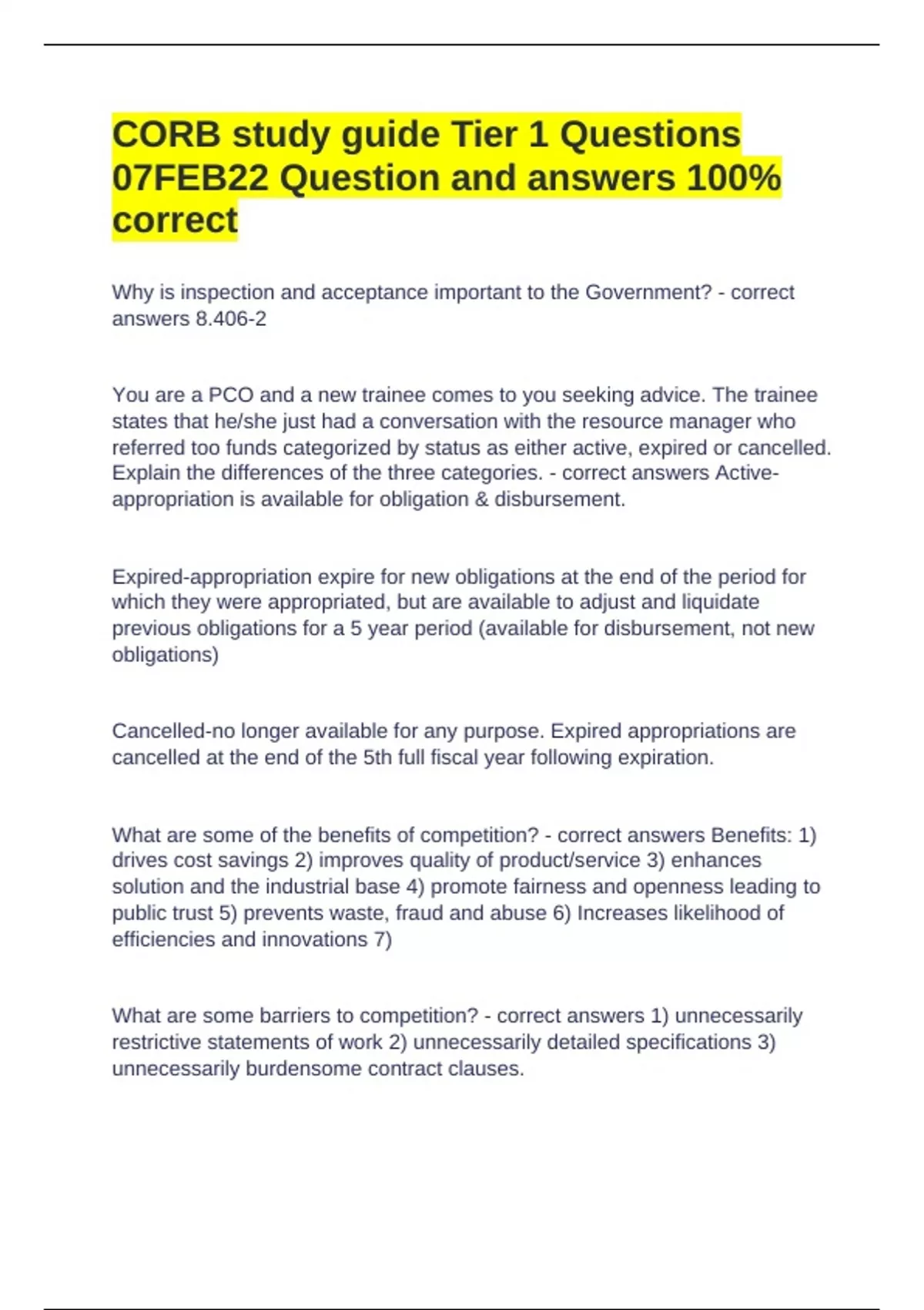 CORB study guide Tier 1 Questions 07FEB22 Question and answers 100% correct Why is inspection and acceptance important to the Government? - correct answers 8.406-2 You are a PCO and a new trainee comes to you seeking advice. The trainee states that he/she just had a conversation with the resource manager who referred too funds categorized by status as either active, expired or cancelled. Explain the differences of the three categories. - correct answers Active-appropriation is available for obligation & disbursement. Expired-appropriation expire for new obligations at the end of the period for which they were appropriated, but are available to adjust and liquidate previous obligations for a 5 year period (available for disbursement, not new obligations) Cancelled-no longer available for any purpose. Expired appropriations are cancelled at the end of the 5th full fiscal year following expiration. What are some of the benefits of competition? - correct answers Benefits: 1) drives cost savi