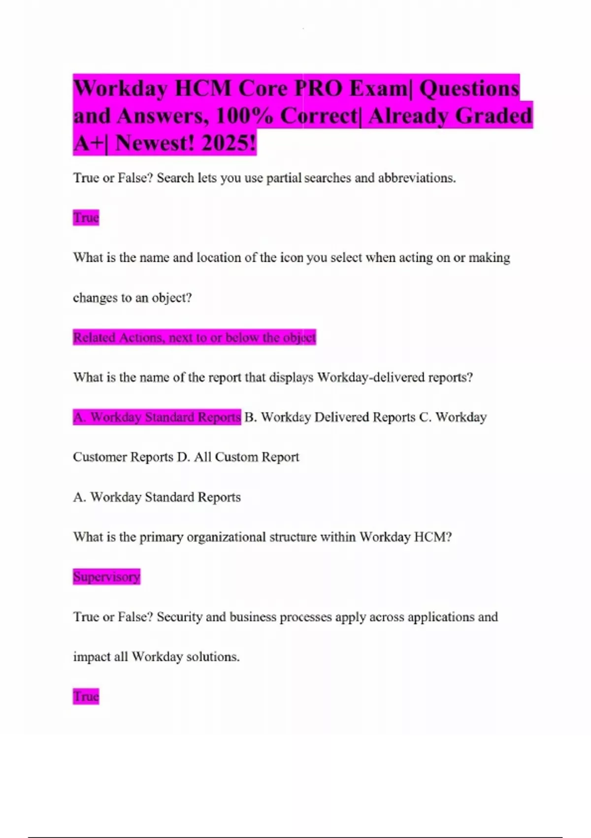 Workday HCM Core PRO Exam| Questions and Answers, 100% Correct| Already Graded A+| Newest! 2025! True or False? Search lets you use partial searches and abbreviations. True What is the name and location of the icon you select when acting on or making changes to an object? Related Actions, next to or below the object What is the name of the report that displays Workday-delivered reports? A. Workday Standard Reports B. Workday Delivered Reports C. Workday Customer Reports D. All Custom Report A. Workday Standard Reports What is the primary organizational structure within Workday HCM? Supervisory True or False? Security and business processes apply across applications and impact all Workday solutions. True What is the foundation of all jobs and positions in Workday? A. Job Profile B. Position C. Job D. Job Family A. Job Profile True or False? You can configure business process steps to route to security groups in order to complete a transaction. True Which of the following changes can you make to supervisory organizations? (Select three correct answers.) A. Create Subordinate B. Divide Organization C. Move Organization D. Assign Superior E. Inherit Organization