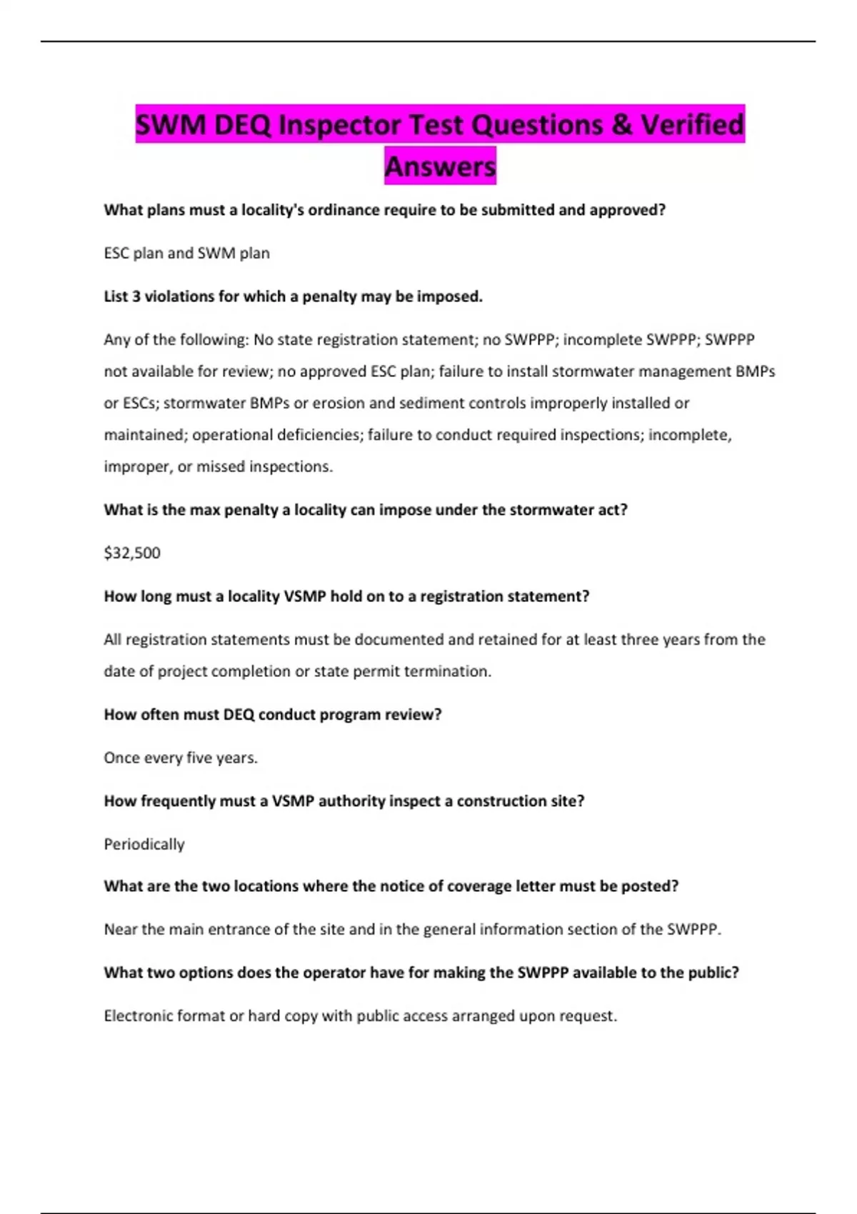 SWM DEQ Inspector Test Questions & Verified Answers