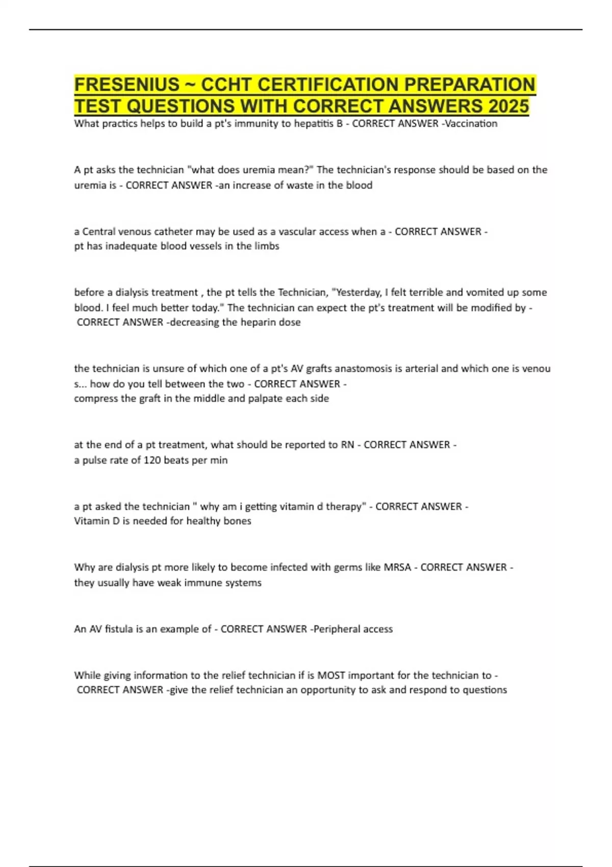 FRESENIUS - CCHT CERTIFICATION PREPARATION TEST QUESTIONS WITH CORRECT ANSWERS 2025