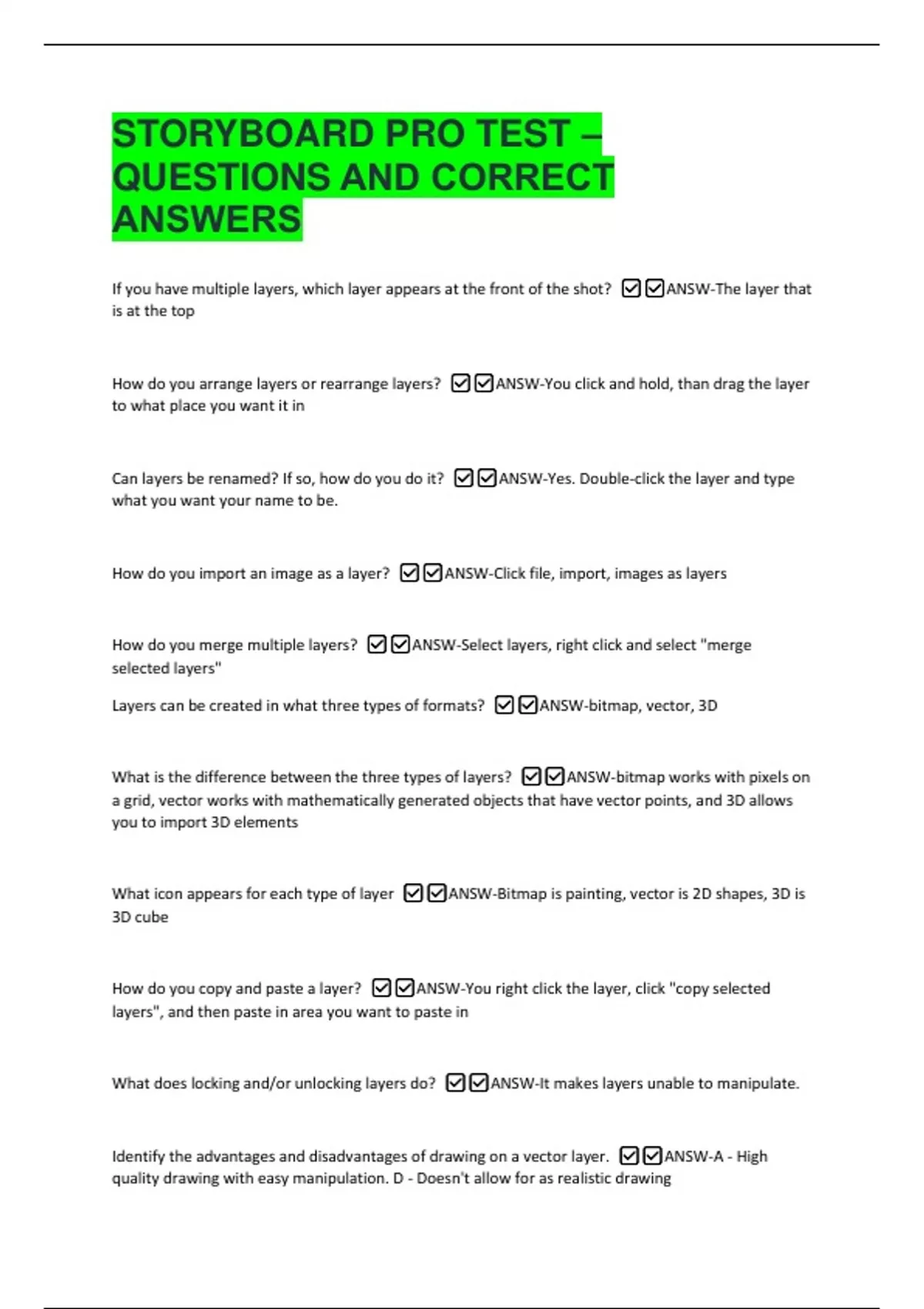 STORYBOARD PRO TEST – QUESTIONS AND CORRECT ANSWERS If you have multiple layers, which layer appears at the front of the shot? ANSW-The layer that is at the top How do you arrange layers or rearrange layers? ANSW-You click and hold, than drag the layer to what place you want it in Can layers be renamed? If so, how do you do it? ANSW-Yes. Double-click the layer and type what you want your name to be. How do you import an image as a layer? ANSW-Click file, import, images as layers