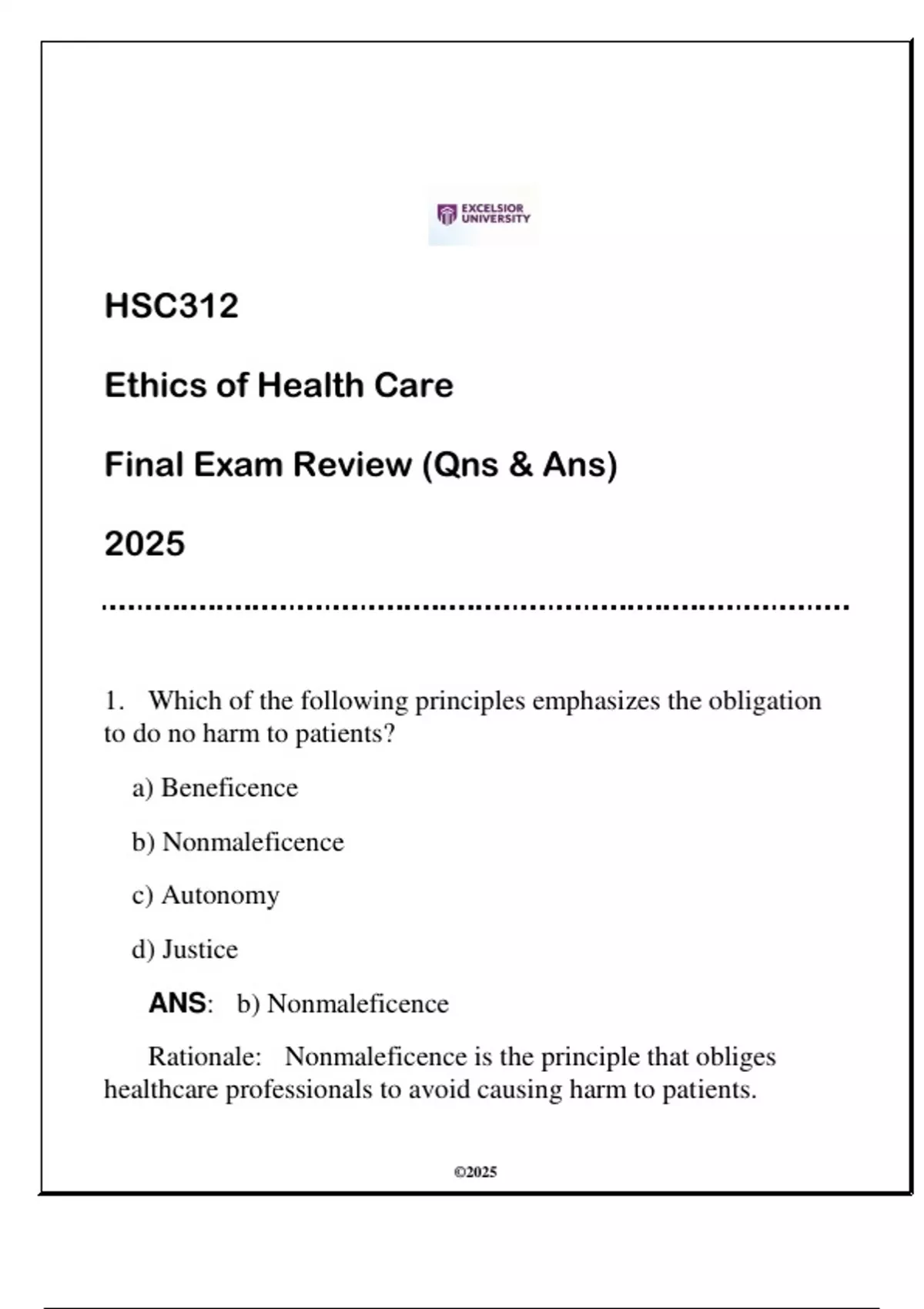 HSC312 Ethics of HC (EU) Final Exam Review 2025 (Qns & Ans)HSC312 Ethics of HC (EU) Final Exam Review 2025 (Qns & Ans)HSC312 Ethics of HC (EU) Final Exam Review 2025 (Qns & Ans)