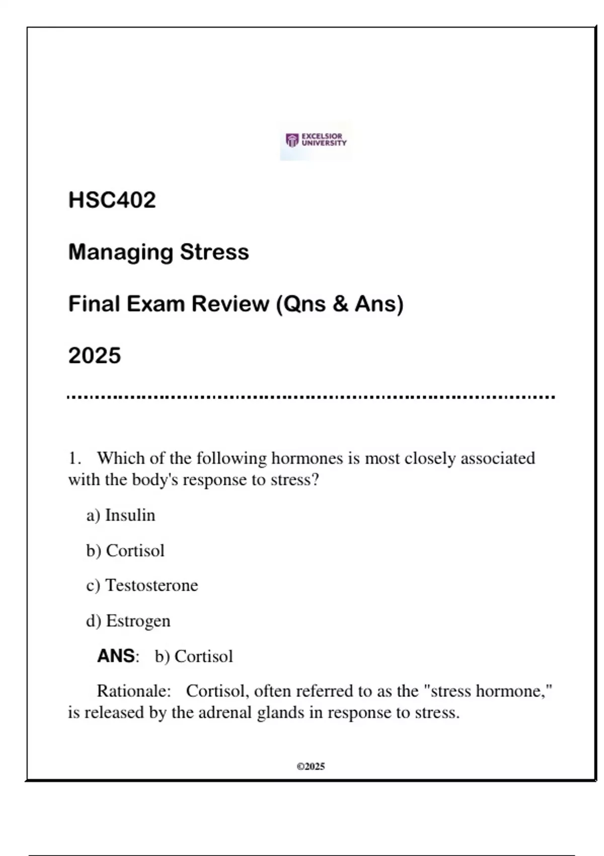 HSC402 Managing Stress (EU) Final Exam Review 2025 (Qns & Ans).
