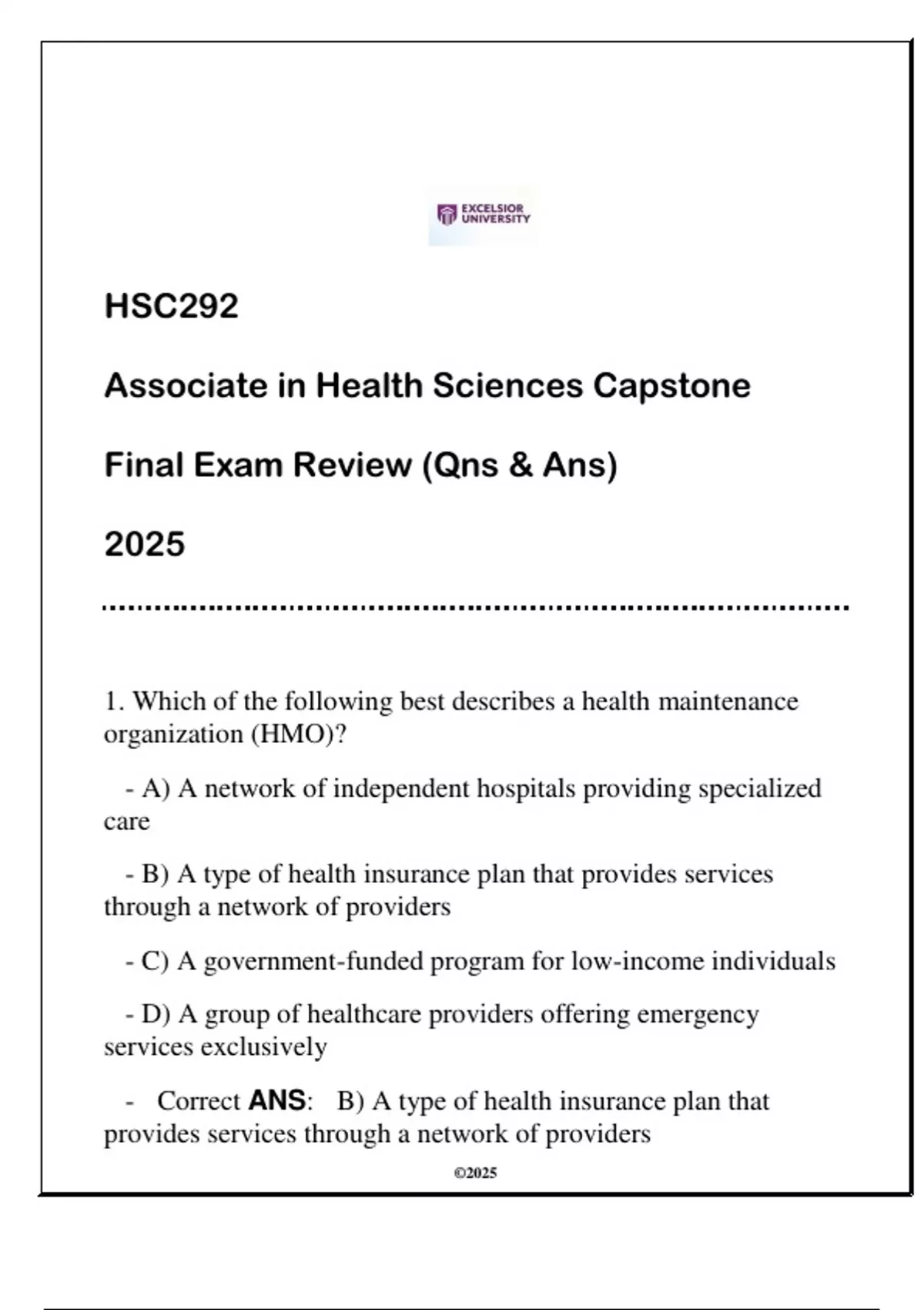 HSC292 Associate in Health Sciences Capstone (EU) Final Exam Review 2025 (Qns & AnsHSC292 Associate in Health Sciences Capstone (EU) Final Exam Review 2025 (Qns & AnsHSC292 Associate in Health Sciences Capstone (EU) Final Exam Review 2025 (Qns & Ans