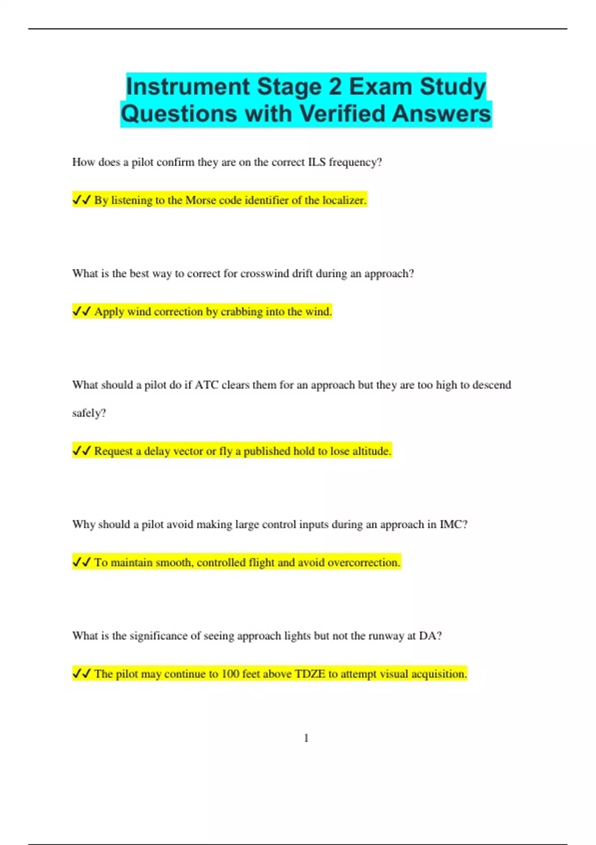 Instrument Stage 2 Exam Study Questions with Verified Answers How does a pilot confirm they are on the correct ILS frequency? By listening to the Morse code identifier of the localizer. What is the best way to correct for crosswind drift during an approach? Apply wind correction by crabbing into the wind. What should a pilot do if ATC clears them for an approach but they are too high to descend safely? Request a delay vector or fly a published hold to lose altitude. Why should a pilot avoid making large control inputs during an approach in IMC? To maintain smooth, controlled flight and avoid overcorrection. What is the significance of seeing approach lights but not the runway at DA? The pilot may continue to 100 feet above TDZE to attempt visual acquisition. 2 How does a pilot recognize a false glide slope indication? By cross-checking altitude, approach angle, and position relative to the runway. What should a pilot do if the CDI needle becomes erratic on final approach? Verify navigation source selection and check for possible signal interference. How can a pilot maintain situational awareness during an IFR approach? By continuously cross-checking instruments and approach progress. What is the primary reason for using a missed approach procedure? To provide a safe escape route if landing is not possible. What should a pilot do if experiencing severe turbulence while on an ILS approach? Maintain a stabilized descent and be prepared to execute a missed approach if necessary. Why is it important to verify barometric pressure settings before descent? To ensure altitude readings are accurate for terrain clearance. 3 How does a pilot recognize they have reached the final approach fix (FAF)? By cross-checking navigation aids, altitudes, and time/distance information. What action should a pilot take if GPS integrity is lost during an RNAV approach? Discontinue the approach and follow backup navigation procedures. How does a pilot confirm that they are established in a holding pattern? By maintaining correct inbound and outbound headings with proper timing adjustments. What is the primary purpose of an instrument approach? To provide a safe descent and landing in low visibility conditions. How can a pilot determine if they are established on the localizer? By observing a centered CDI needle with minimal corrections. What should a pilot do if they lose visual contact with the runway after passing DA? Execute a missed approach immediately. 4 Why is it important to brief the missed approach procedure before starting the approach? To be prepared for immediate execution if required. What does a single dot deflection on the glide slope indicate? The aircraft is slightly above or below the ideal descent path. What action should a pilot take if ATC issues a revised clearance during an approach? Read back the clearance, confirm details, and comply