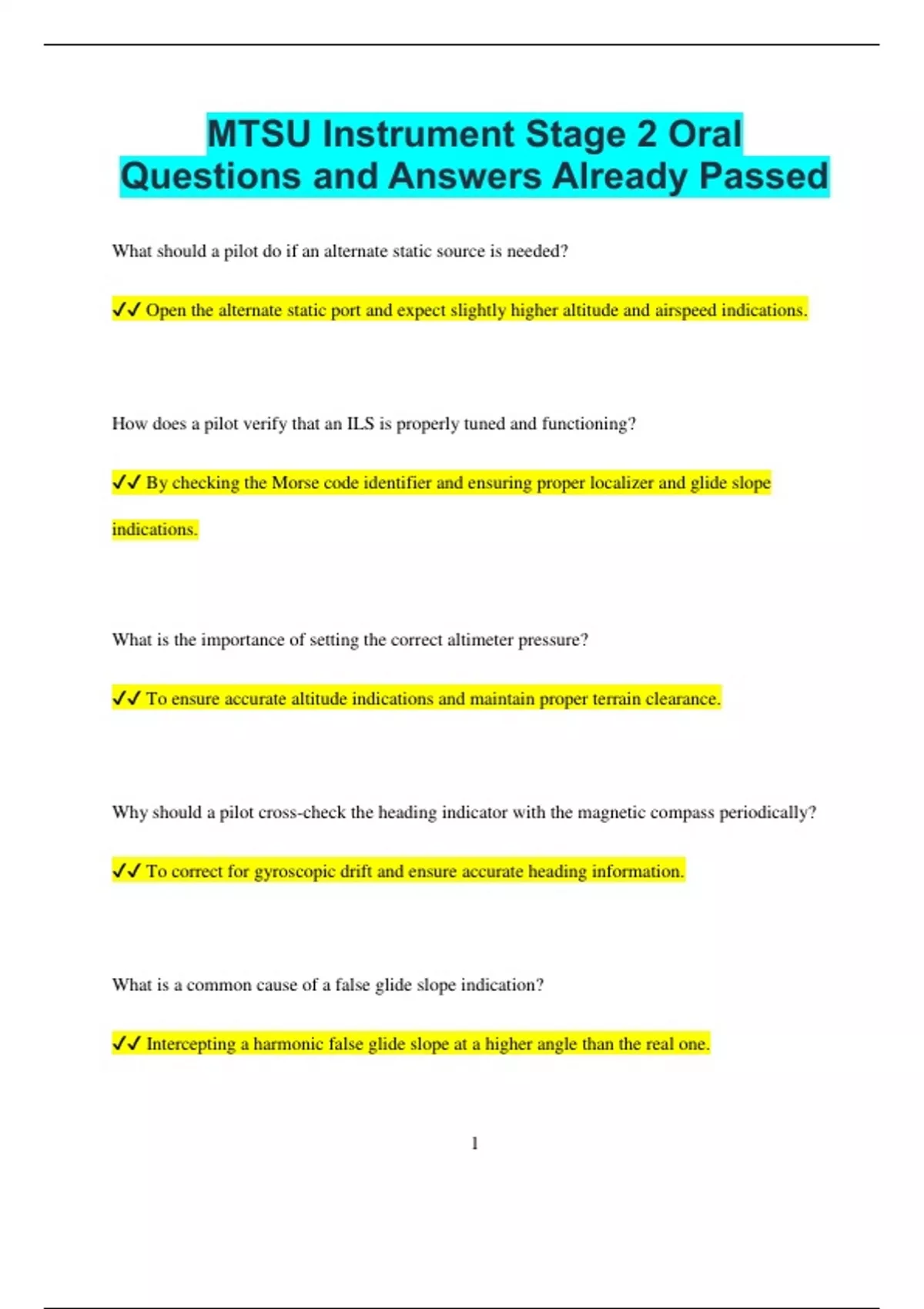MTSU Instrument Stage 2 Oral Questions and Answers Already Passed What should a pilot do if an alternate static source is needed? Open the alternate static port and expect slightly higher altitude and airspeed indications. How does a pilot verify that an ILS is properly tuned and functioning? By checking the Morse code identifier and ensuring proper localizer and glide slope indications. What is the importance of setting the correct altimeter pressure? To ensure accurate altitude indications and maintain proper terrain clearance. Why should a pilot cross-check the heading indicator with the magnetic compass periodically? To correct for gyroscopic drift and ensure accurate heading information. What is a common cause of a false glide slope indication? Intercepting a harmonic false glide slope at a higher angle than the real one. 2 How does a pilot determine wind correction in a holding pattern? By adjusting the outbound heading to compensate for wind drift and maintaining proper leg timing. What is the purpose of a stepdown fix on a non-precision approach? To provide additional descent guidance before reaching the final approach fix. Why should a pilot monitor fuel consumption closely during IFR flight? To ensure adequate reserves in case of holding or diversion. What should a pilot do if they encounter icing conditions while flying on instruments? Activate anti-icing/de-icing equipment, exit the icing conditions, and report to ATC. What is the function of the marker beacons on an ILS approach? To provide range information to the runway threshold. How does a pilot ensure proper tracking of a VOR radial? By centering the CDI needle with a TO or FROM indication and correcting for wind drift. 3 What should a pilot do if they receive an amended clearance while enroute? Read back the new clearance, verify any changes, and comply with ATC instructions. Why is it important to brief the instrument approach before starting the descent? To be fully prepared for altitudes, headings, and missed approach procedures. What is the primary purpose of a holding