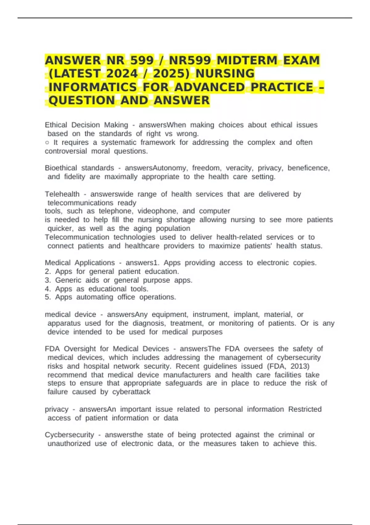NR 599 / NR599 Midterm Exam (Latest 2022 / 2023) Nursing Informatics for Advanced Practice - Chamberlain College
