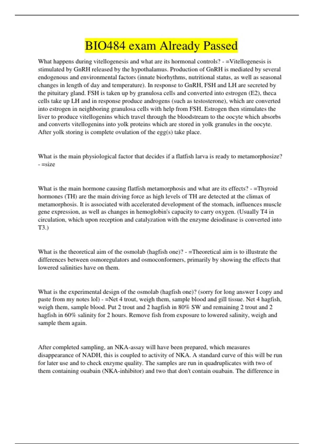 BIO484 exam Already Passed