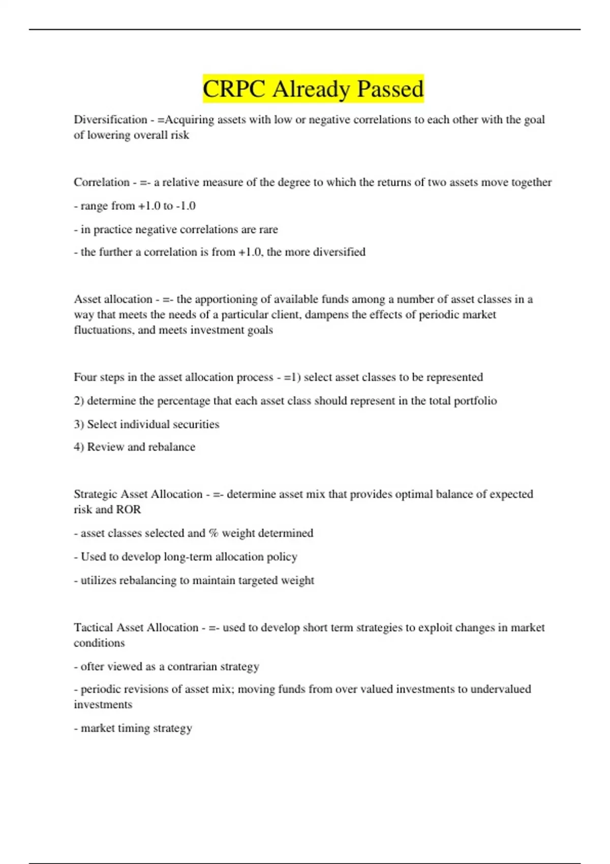 Strategic Asset Allocation - =- determine asset mix that provides optimal balance of expected