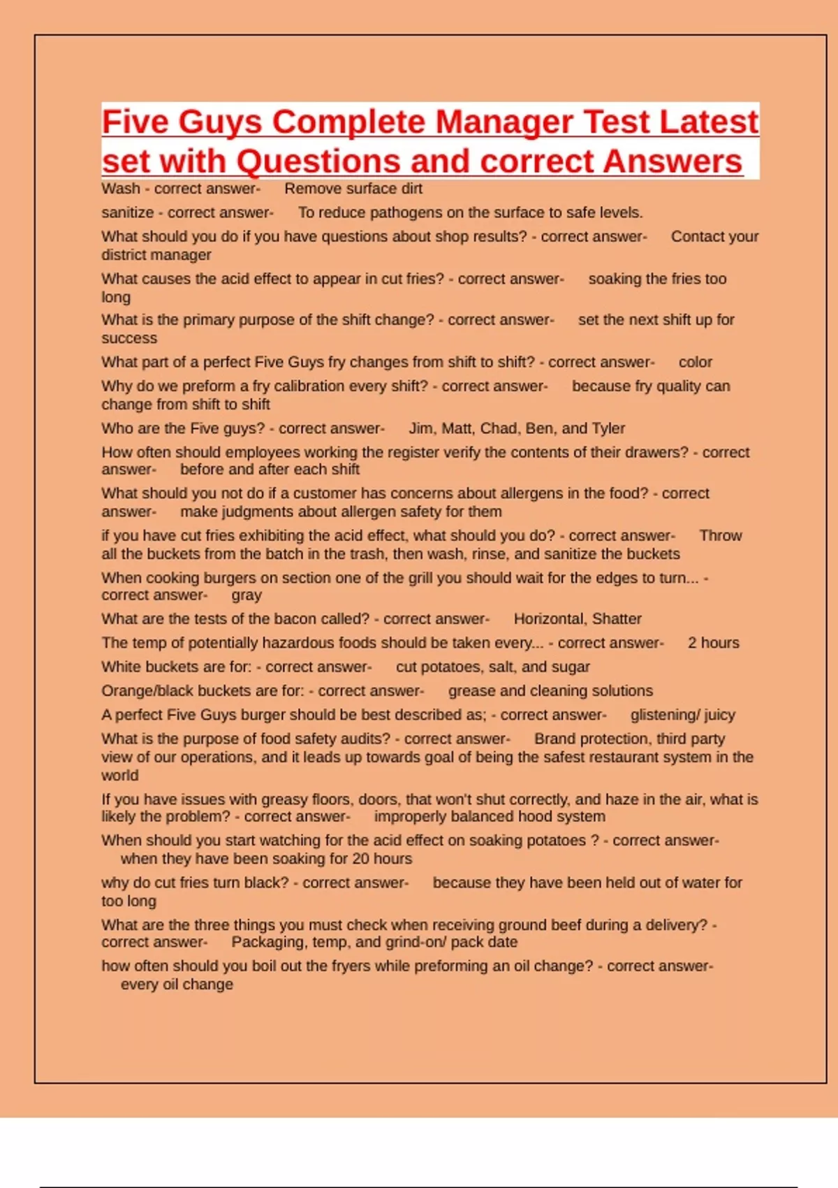 Five Guys Complete Manager Test Latest set with Questions and correct Answers