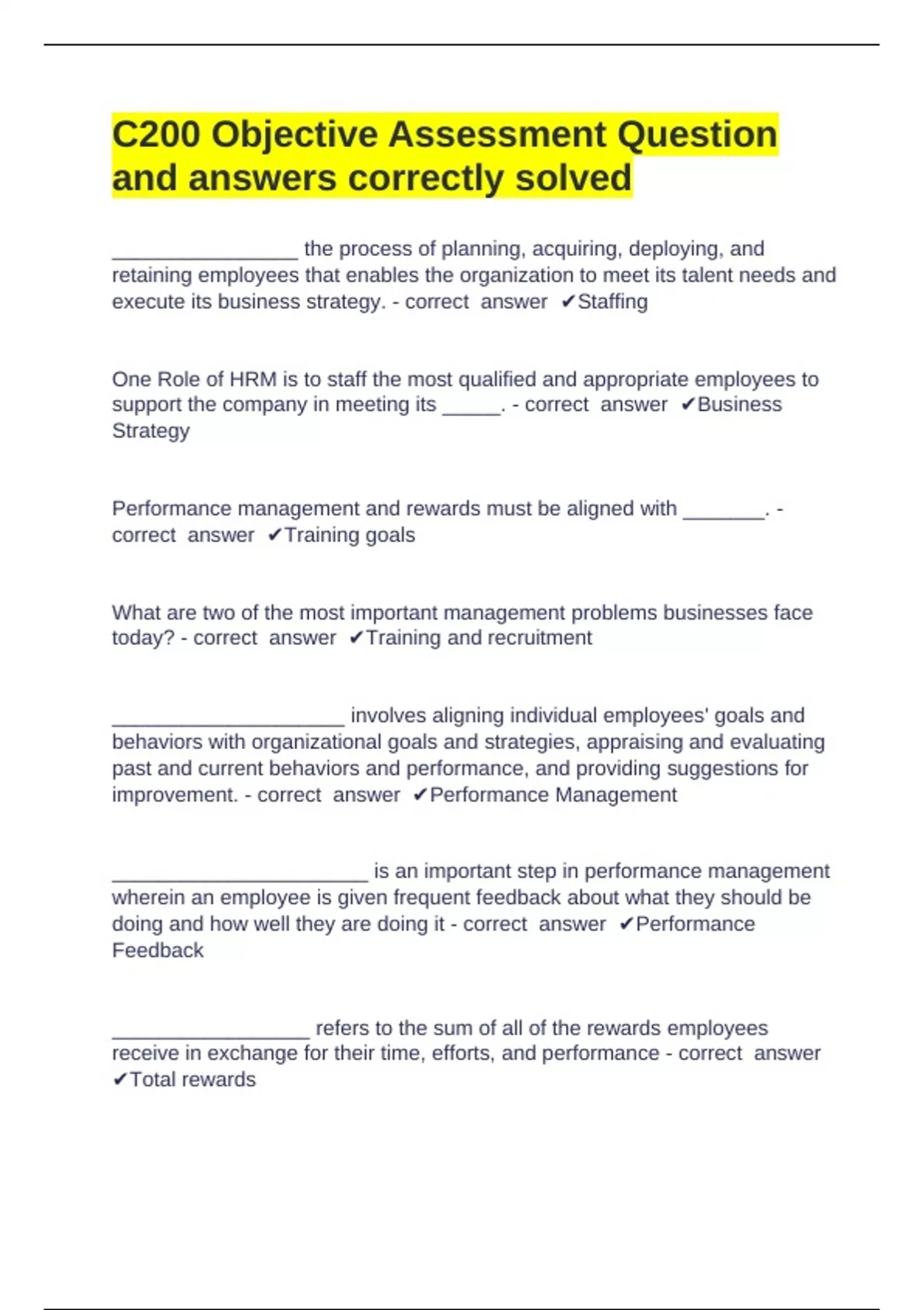 C200 Objective Assessment Question and answers correctly solved ________________ the process of planning, acquiring, deploying, and retaining employees that enables the organization to meet its talent needs and execute its business strategy. - correct answer Staffing One Role of HRM is to staff the most qualified and appropriate employees to support the company in meeting its _____. - correct answer Business Strategy Performance management and rewards must be aligned with _______. - correct answer Training goals What are two of the most important management problems businesses face today? - correct answer Training and recruitment ____________________ involves aligning individual employees' goals and behaviors with organizational goals and strategies, appraising and evaluating past and current behaviors and performance, and providing suggestions for improvement. - correct answer Performance Management ______________________ is an important step in performance management wherein an employee is given frequent feedback about what they should be doing and how well they are doing it - correct answer Performance Feedback _________________ refers to the sum of all of the rewards employees receive in exchange for their time, efforts, and performance - correct answer Total rewards