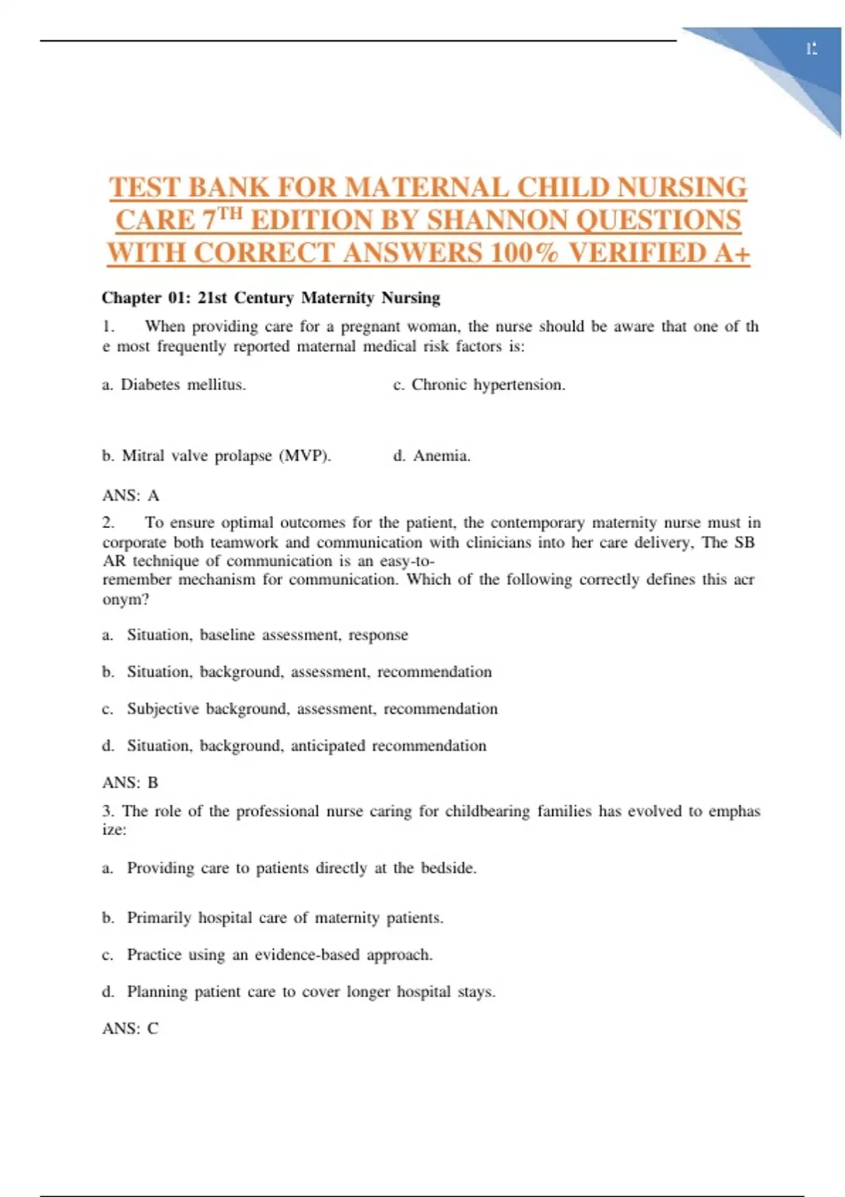 TEST BANK FOR MATERNAL CHILD NURSING CARE 7TH EDITION BY SHANNON QUESTIONS WITH CORRECT ANSWERS 100% VERIFIED A+ Chapter 01: 21st Century Maternity Nursing 1. When providing care for a pregnant woman, the nurse should be aware that one of the most frequently reported maternal medical risk factors is: a. Diabetes mellitus. c. Chronic hypertension. b. Mitral valve prolapse (MVP). d. Anemia. ANS: A 2. To ensure optimal outcomes for the patient, the contemporary maternity nurse must incorporate both teamwork and communication with clinicians into her care delivery, The SBAR technique of communication is an easy-to-remember mechanism for communication. Which of the following correctly defines this acronym? a. Situation, baseline assessment, response b. Situation, background, assessment, recommendation c. Subjective background, assessment, recommendation d. Situation, background, anticipated recommendation ANS: B 3. The role of the professional nurse caring for childbearing families has evolved to emphasize: a. Providing care to patients directly at the bedside. b. Primarily hospital care of maternity patients. c. Practice using an evidence-based approach. d. Planning patient care to cover longer hospital stays.