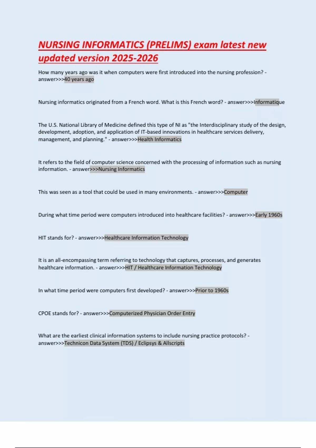NURSING INFORMATICS (PRELIMS) exam latest new