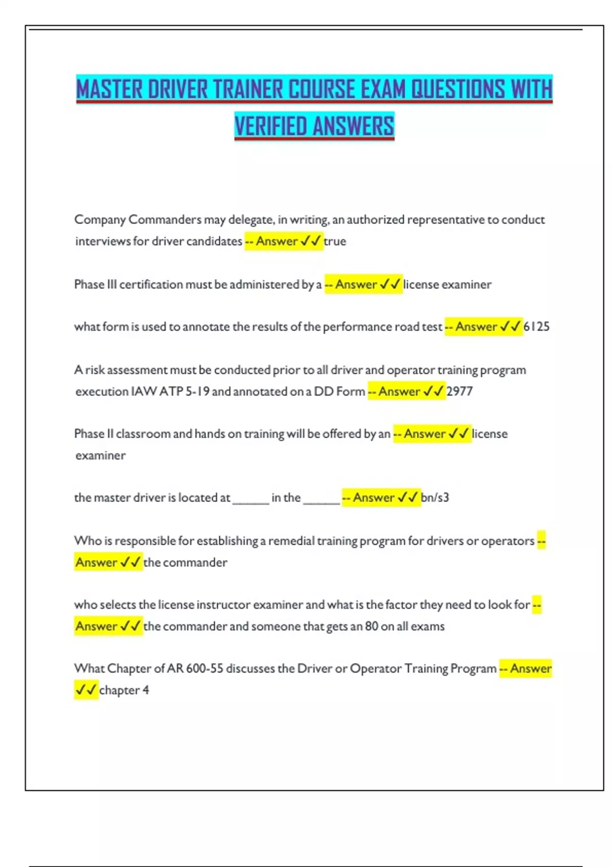 MASTER DRIVER TRAINER COURSE EXAM QUESTIONS WITH VERIFIED ANSWERS