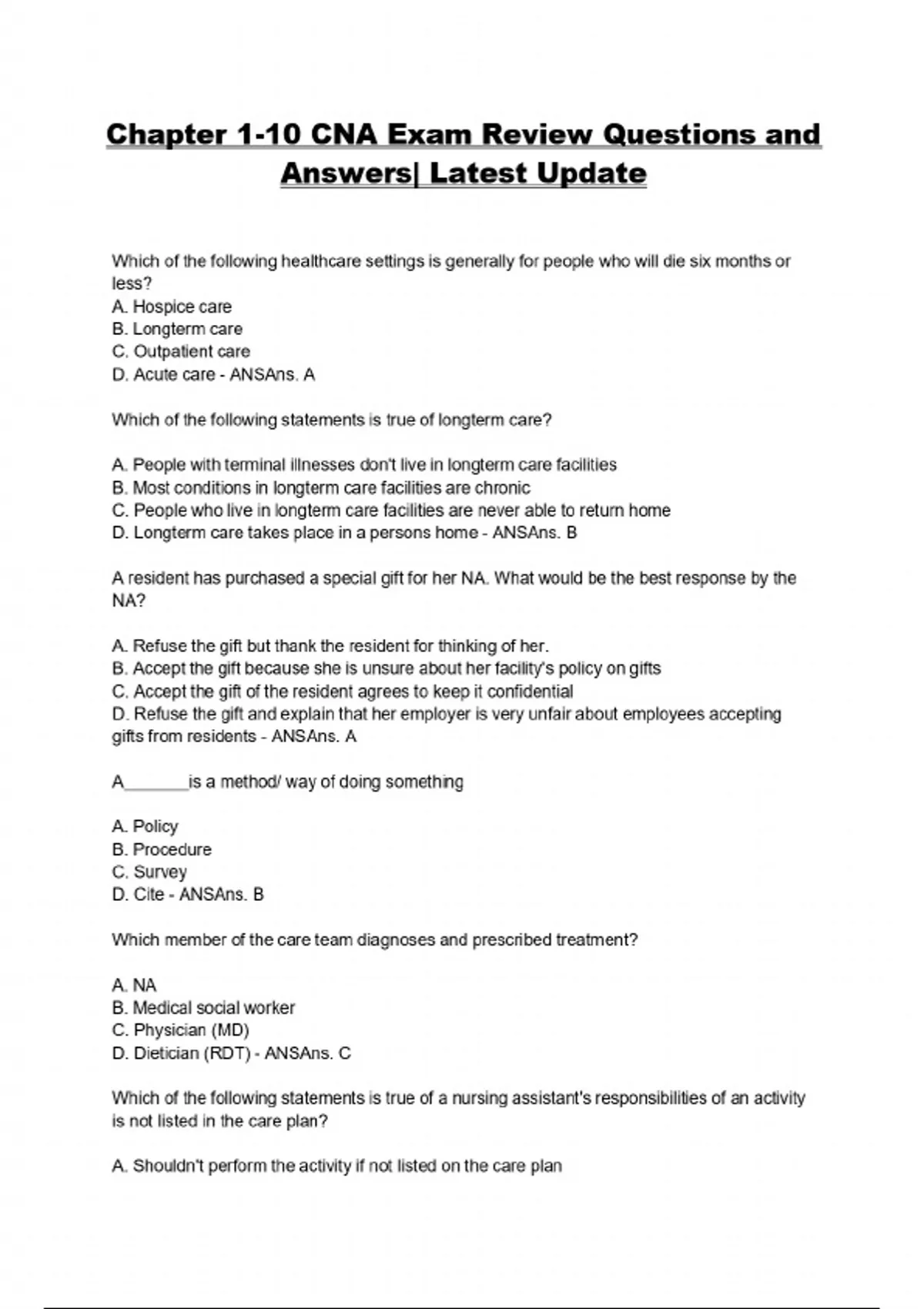 chapter 1 10 cna exam review questions and answer