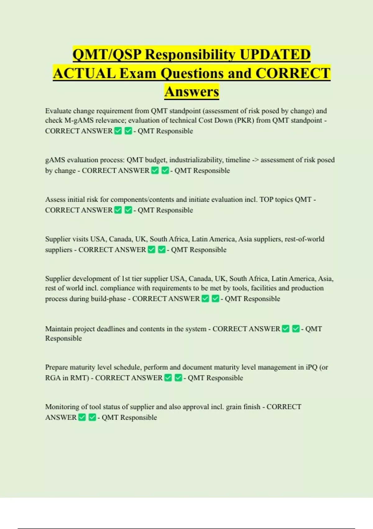 QMT/QSP Responsibility UPDATED ACTUAL Exam Questions and CORRECT Answers