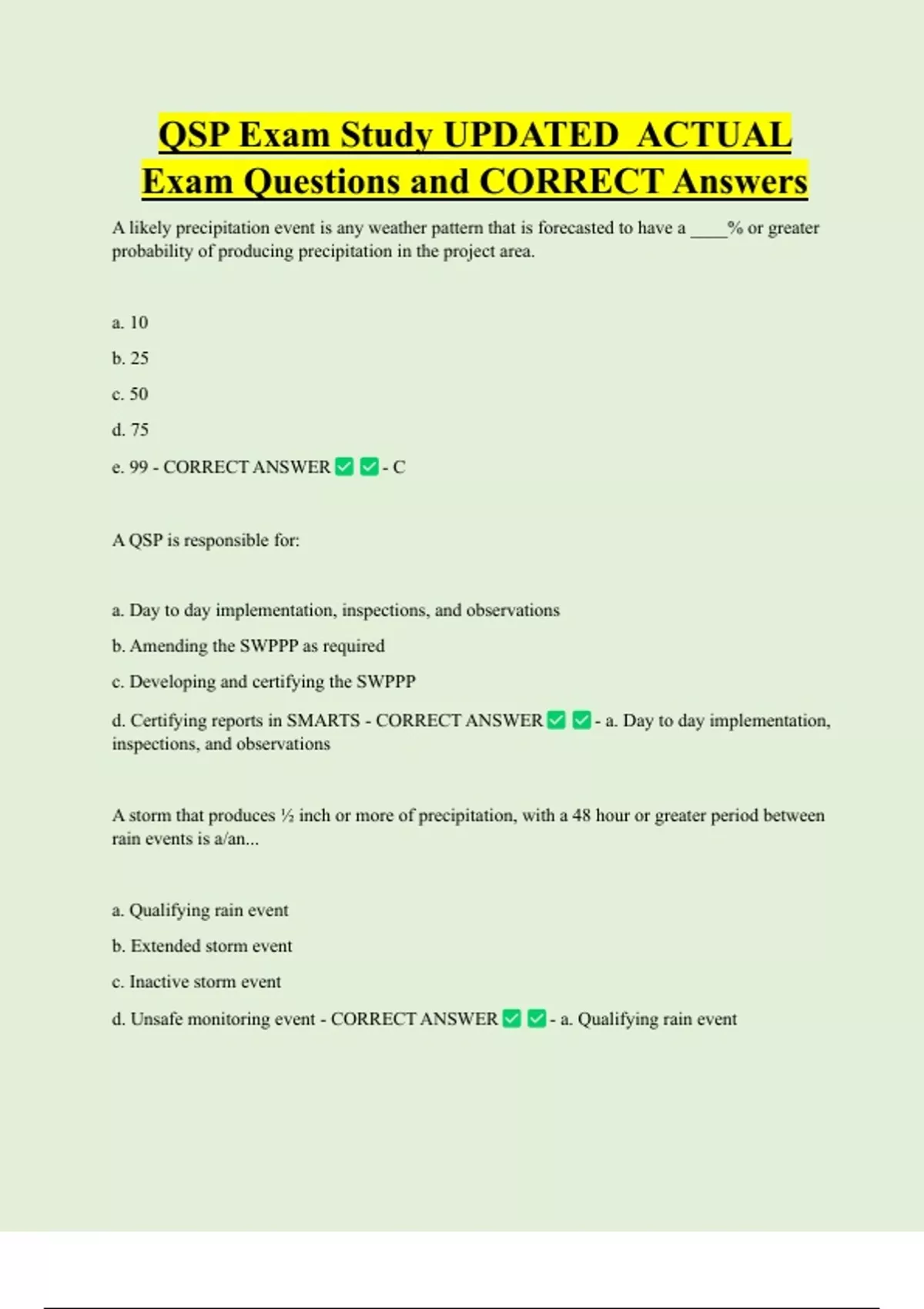 QSP Exam Study UPDATED ACTUAL Exam Questions and CORRECT Answers A likely precipitation event is any weather pattern that is forecasted to have a ____% or greater probability of producing precipitation in the project area. a. 10 b. 25 c. 50 d. 75 e. 99 - CORRECT ANSWER A QSP is responsible for: - C