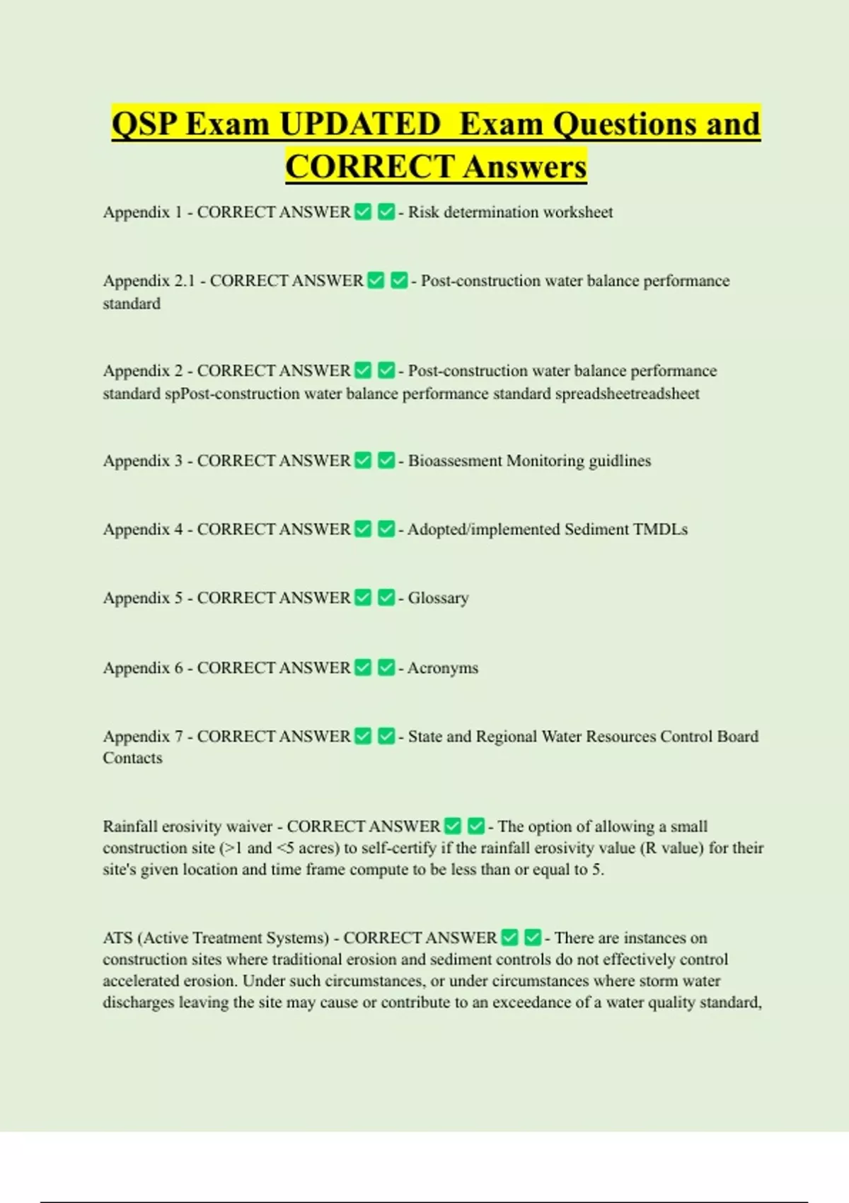 QSP Exam UPDATED Exam Questions and CORRECT Answers Appendix 1 - CORRECT ANSWER Appendix 2.1 - CORRECT ANSWER standard Appendix 2 - CORRECT ANSWER - Risk determination worksheet - Post-construction water balance performance - Post-construction water balance performance standard spPost-construction water balance performance standard spreadsheetreadsheet
