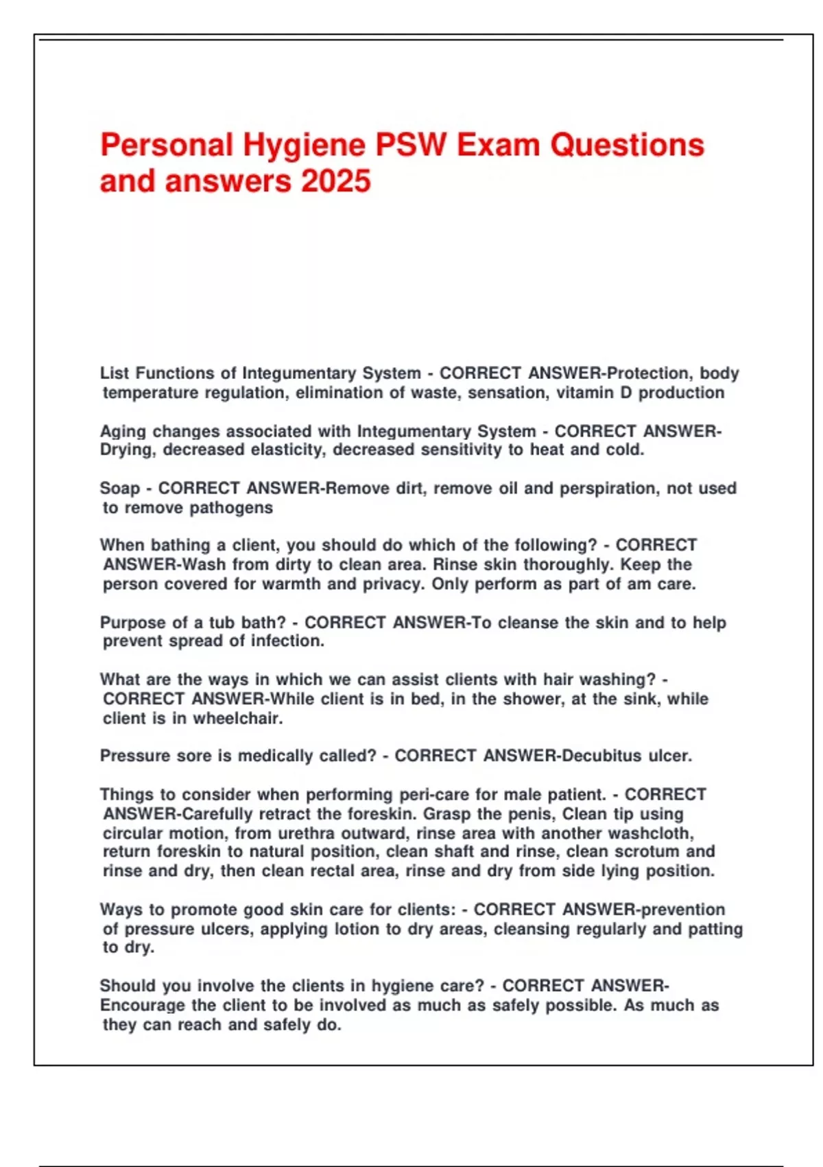 Personal Hygiene PSW Exam Questions and answers 2025.