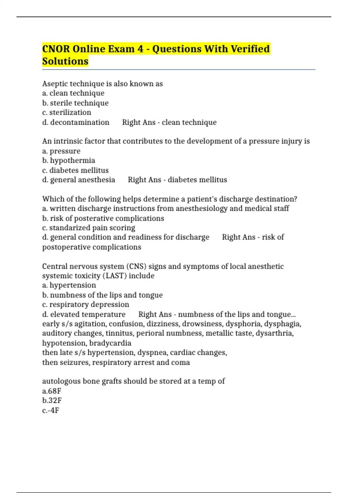 CNOR Online Exam 4 - Questions With Verified