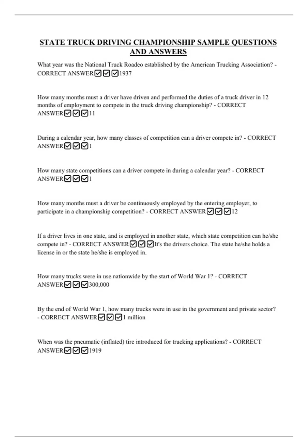 STATE TRUCK DRIVING CHAMPIONSHIP SAMPLE QUESTIONS AND ANSWERS What year was the National Truck Roadeo established by the American Trucking Association? - CORRECT ANSWER1937