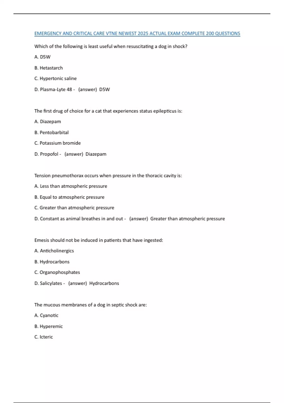 EMERGENCY AND CRITICAL CARE VTNE NEWEST 2025 ACTUAL EXAM COMPLETE 200 QUESTIONS