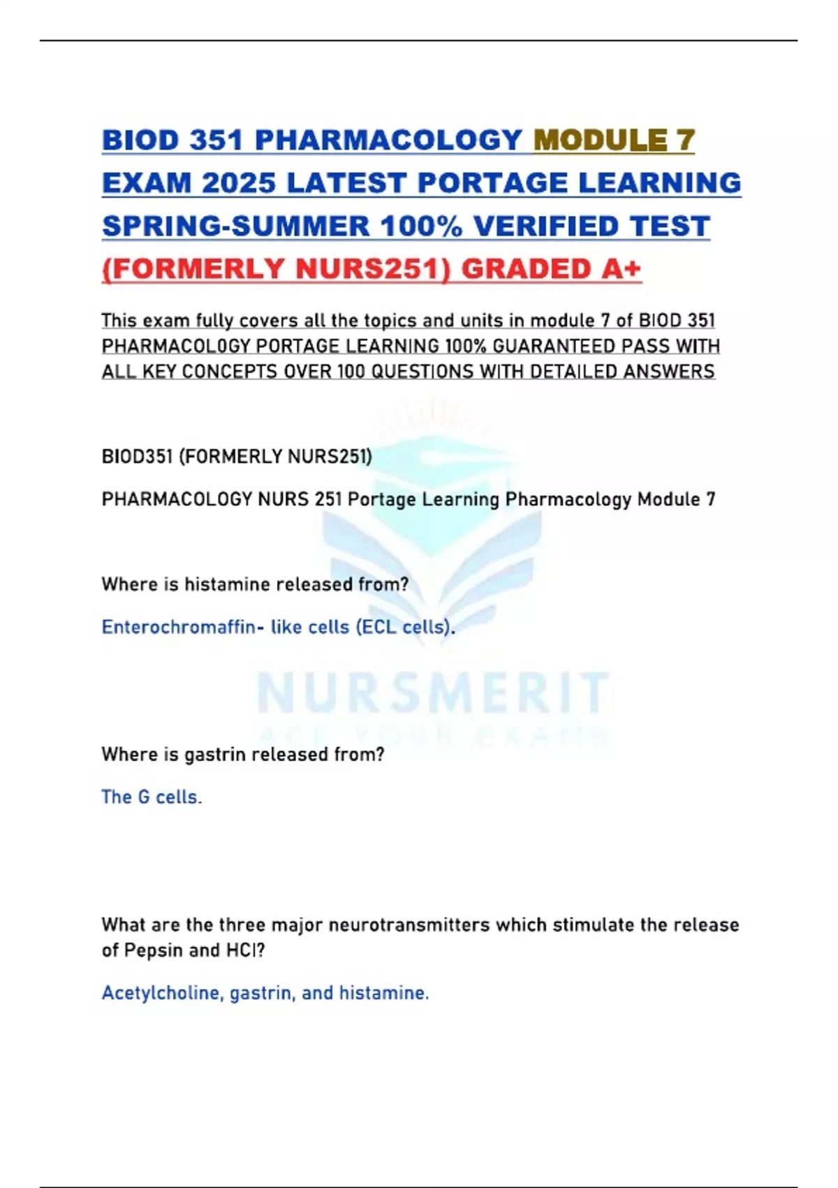 BIOD 351 PHARMACOLOGY MODULE 7 EXAM 2025 LATEST PORTAGE LEARNING SPRING-SUMMER 100% VERIFIED TEST (FORMERLY NURS251) GRADED A+