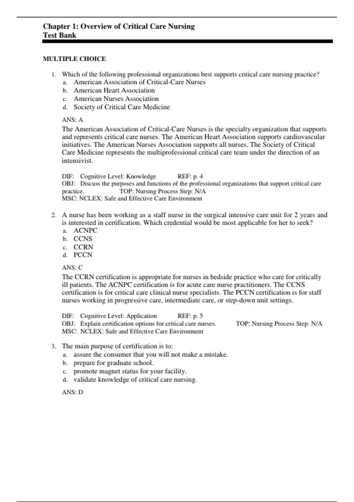 OBJ: Explain certification options for critical care nurses. TOP: Nursing Process Step: N/A