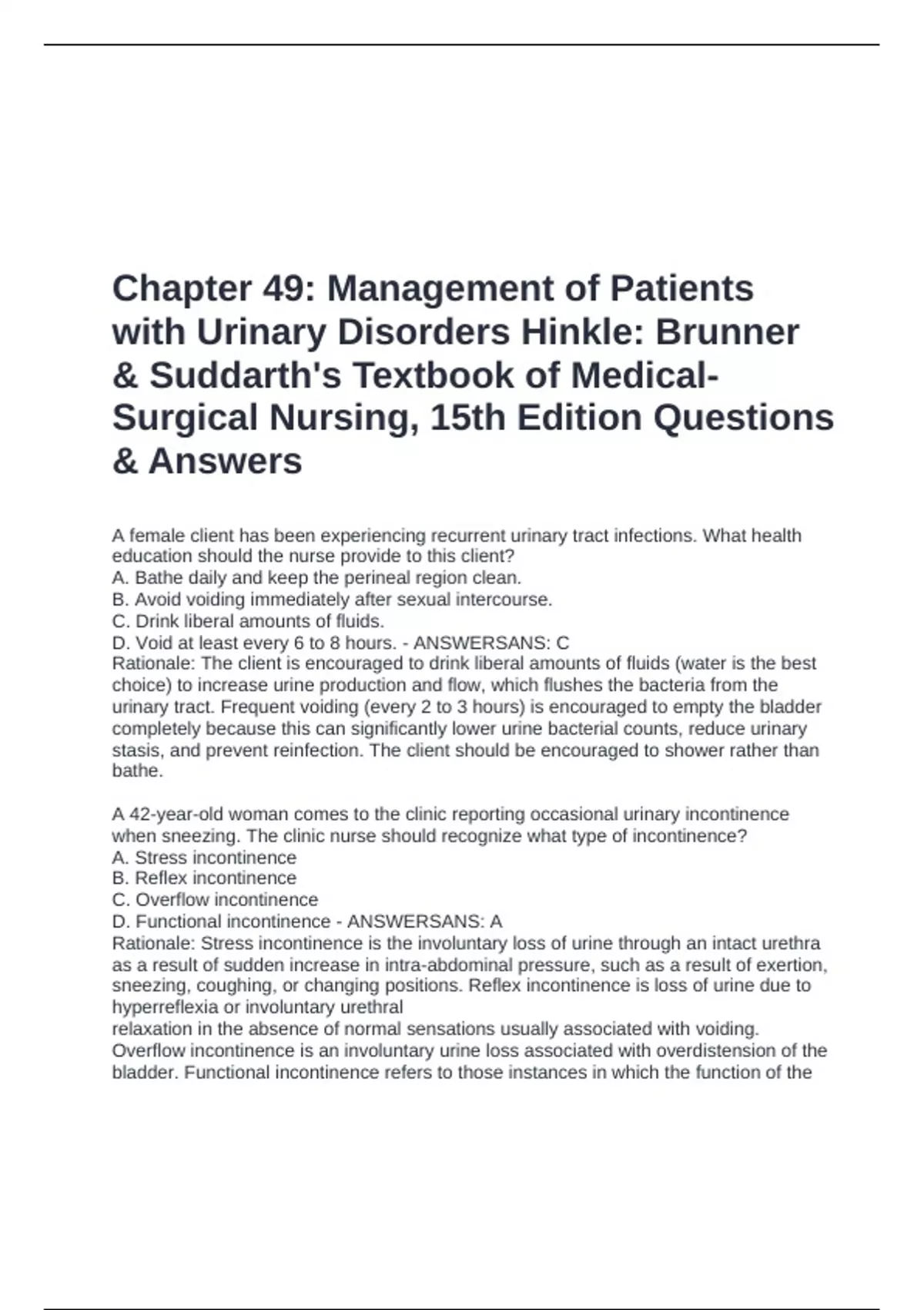 Chapter 49: Management of Patients with Urinary Disorders Hinkle: Brunner & Suddarth's Textbook of Medical-Surgical Nursing, 15th Edition Questions & Answers