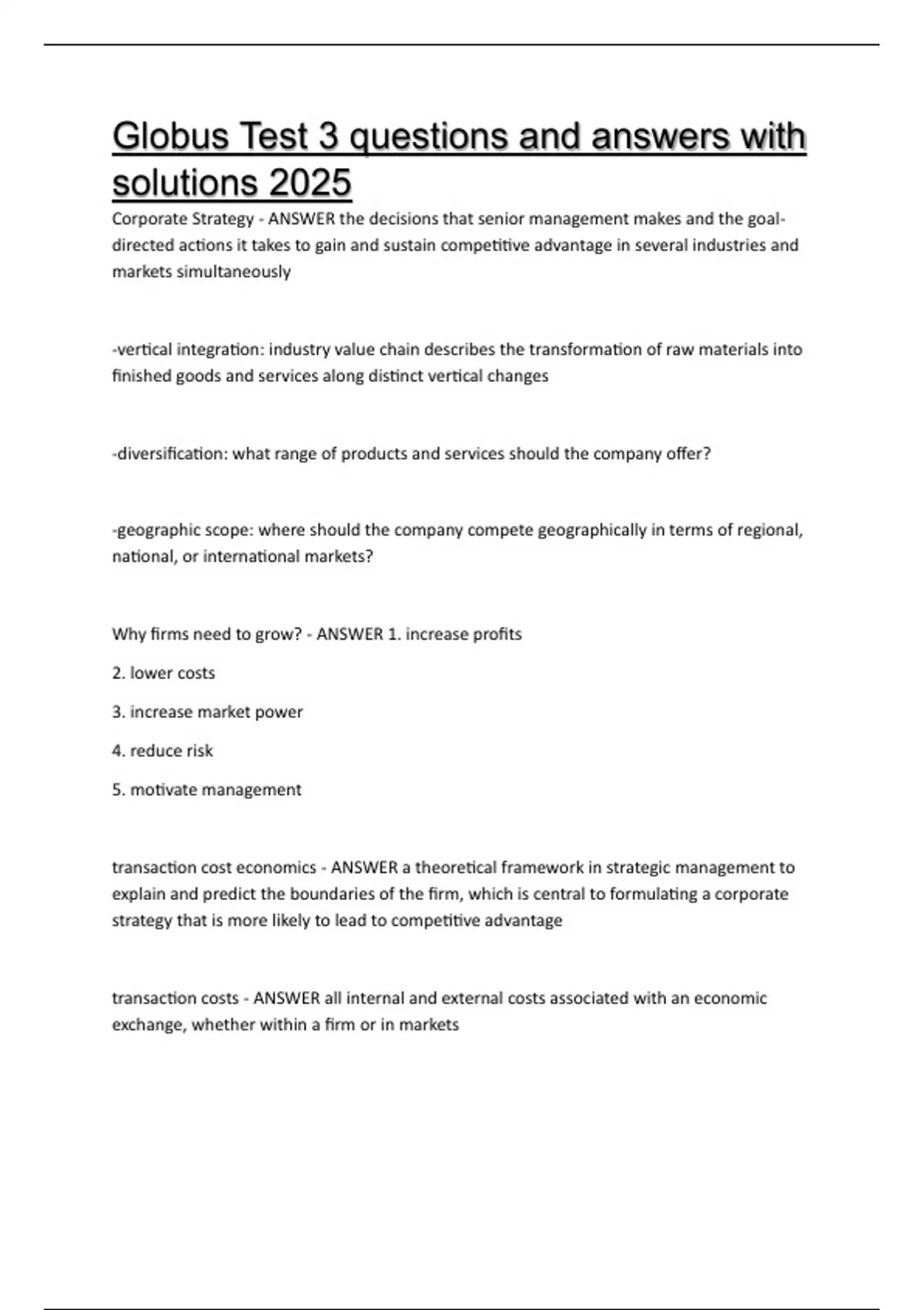 transaction cost economics - ANSWER a theoretical framework in strategic management to