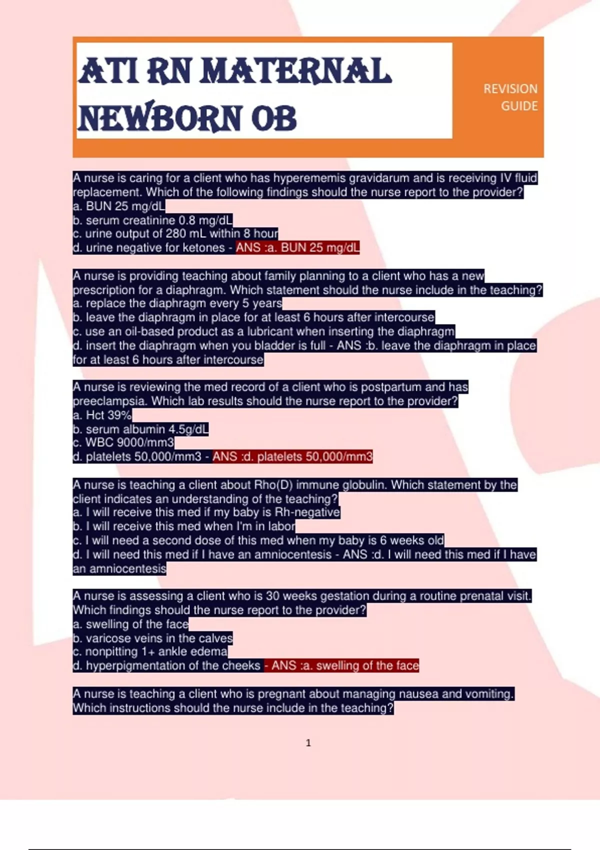 ATI RN MATERNAL OB REVISION QUIZS