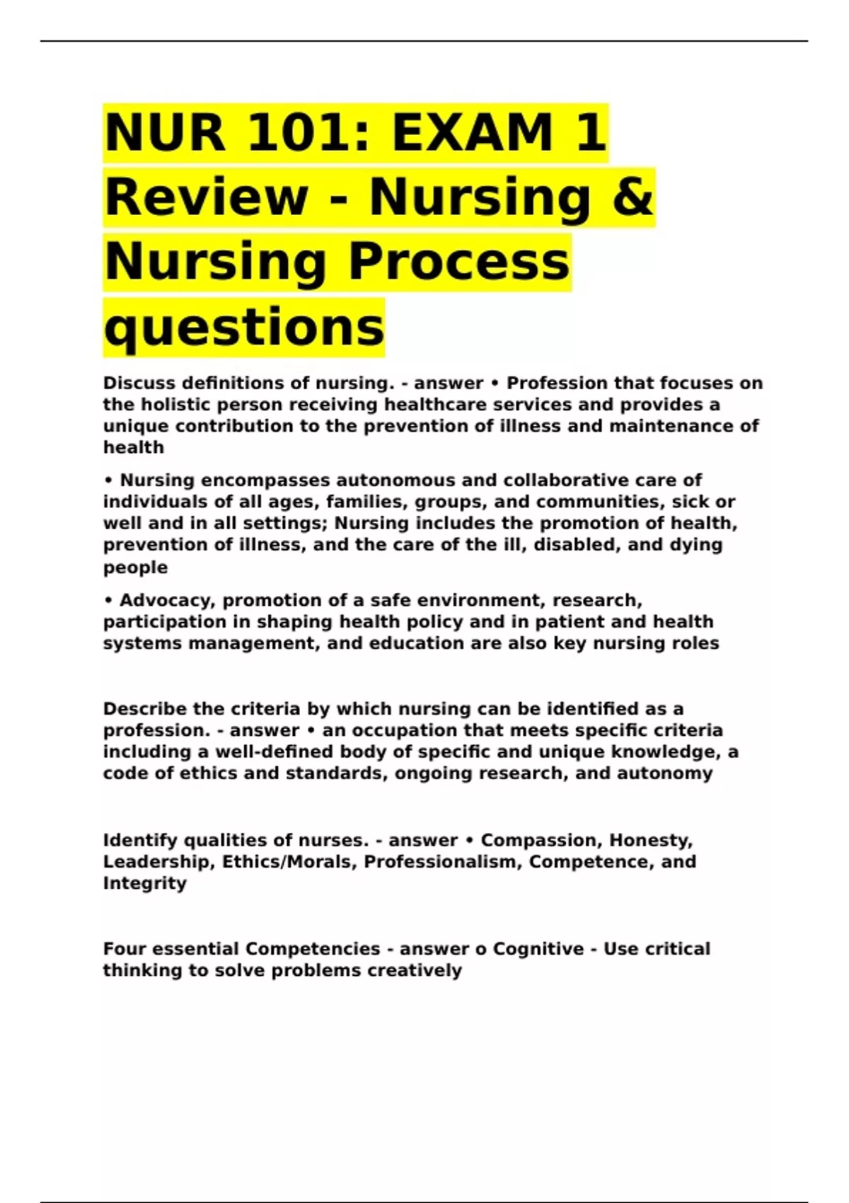 NUR 101 EXAM 1 Review - Nursing & Nursing Process questions.