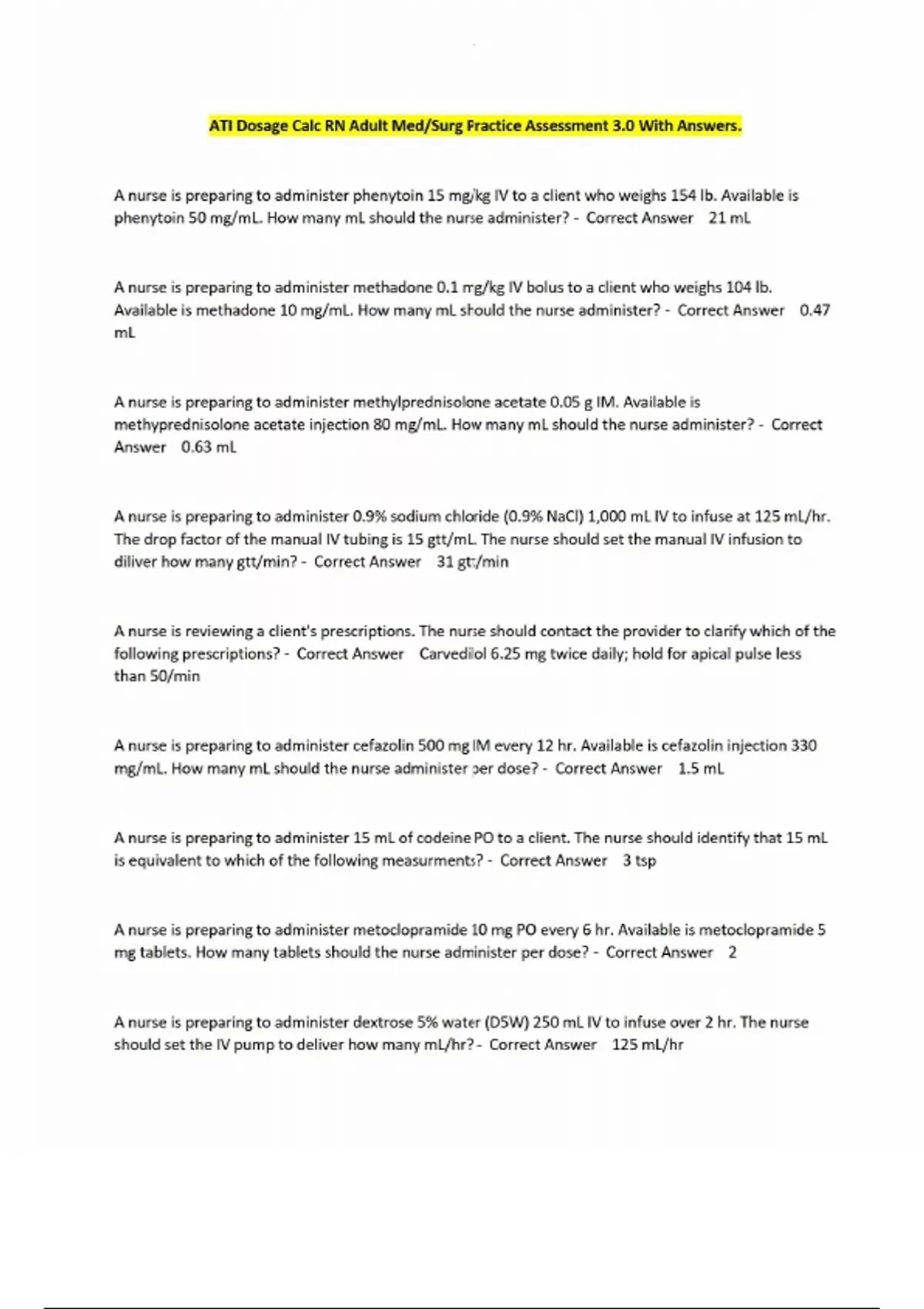 ATI Dosage Calc RN Adult Med/Surg Practice Assessment 3.0 With Answers.