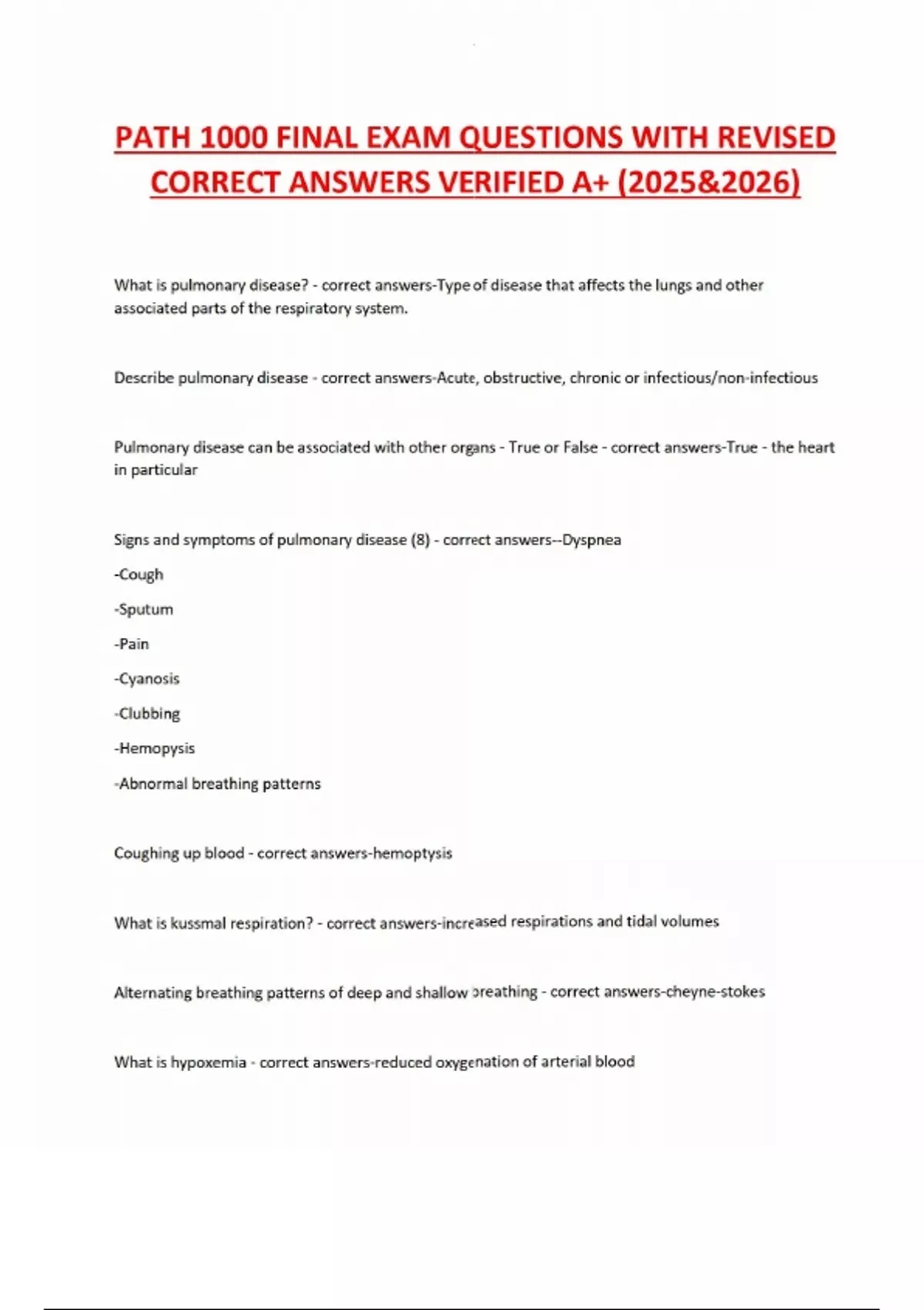 PATH 1000 FINAL EXAM QUESTIONS WITH REVISED CORRECT ANSWERS VERIFIED A+ (2025&2026) What is pulmonary disease? - correct answers-Type of disease that affects the lungs and other associated parts of the respiratory system. Describe pulmonary disease - correct answers-Acute, obstructive, chronic or infectious/non-infectious Pulmonary disease can be associated with other organs - True or False - correct answers-True - the heart in particular Signs and symptoms of pulmonary disease (8) - correct answers--Dyspnea -Cough -Sputum -Pain -Cyanosis -Clubbing -Hemopysis -Abnormal breathing patterns Coughing up blood - correct answers-hemoptysis What is kussmal respiration? - correct answers-increased respirations and tidal volumes Alternating breathing patterns of deep and shallow breathing - correct answers-cheyne-stokes What is hypoxemia - correct answers-reduced oxygenation of arterial blood