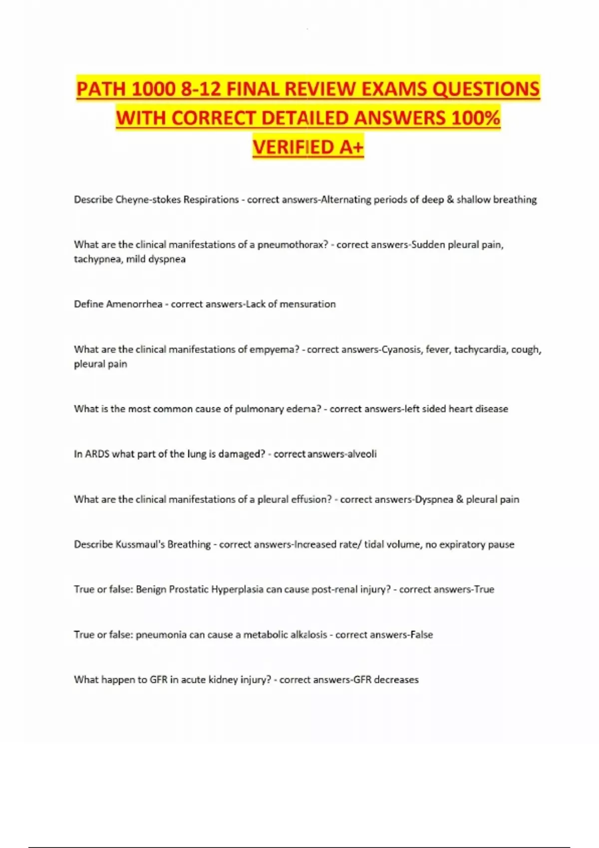 PATH 1000 8-12 FINAL REVIEW EXAMS QUESTIONS WITH CORRECT DETAILED ANSWERS 100% VERIFIED A+ Describe Cheyne-stokes Respirations - correct answers-Alternating periods of deep & shallow breathing What are the clinical manifestations of a pneumothorax? - correct answers-Sudden pleural pain, tachypnea, mild dyspnea Define Amenorrhea - correct answers-Lack of mensuration What are the clinical manifestations of empyema? - correct answers-Cyanosis, fever, tachycardia, cough, pleural pain What is the most common cause of pulmonary edema? - correct answers-left sided heart disease In ARDS what part of the lung is damaged? - correct answers-alveoli What are the clinical manifestations of a pleural effusion? - correct answers-Dyspnea & pleural pain Describe Kussmaul's Breathing - correct answers-Increased rate/ tidal volume, no expiratory pause True or false: Benign Prostatic Hyperplasia can cause post-renal injury? - correct answers-True True or false: pneumonia can cause a metabolic alkalosis - correct answers-False What happen to GFR in acute kidney injury? - correct answers-GFR decreases