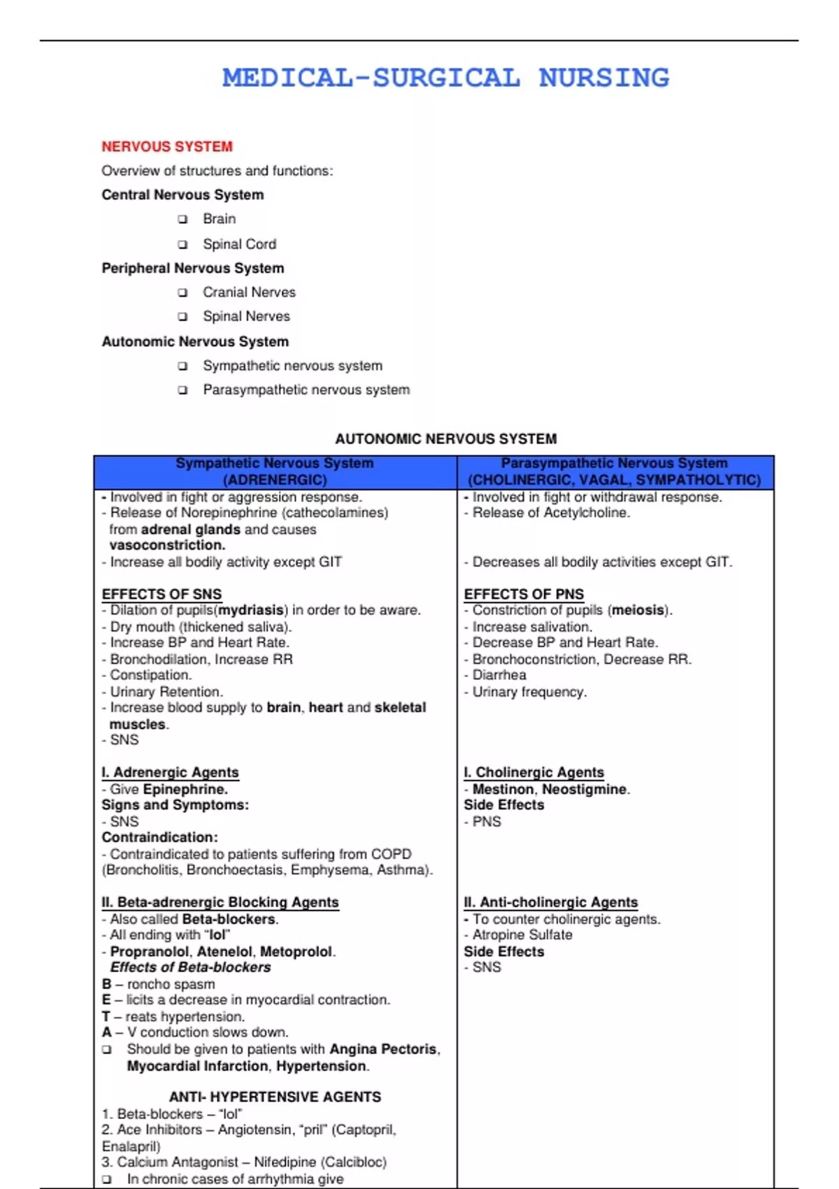 II. Beta-adrenergic Blocking Agents II. Anti-cholinergic Agents
