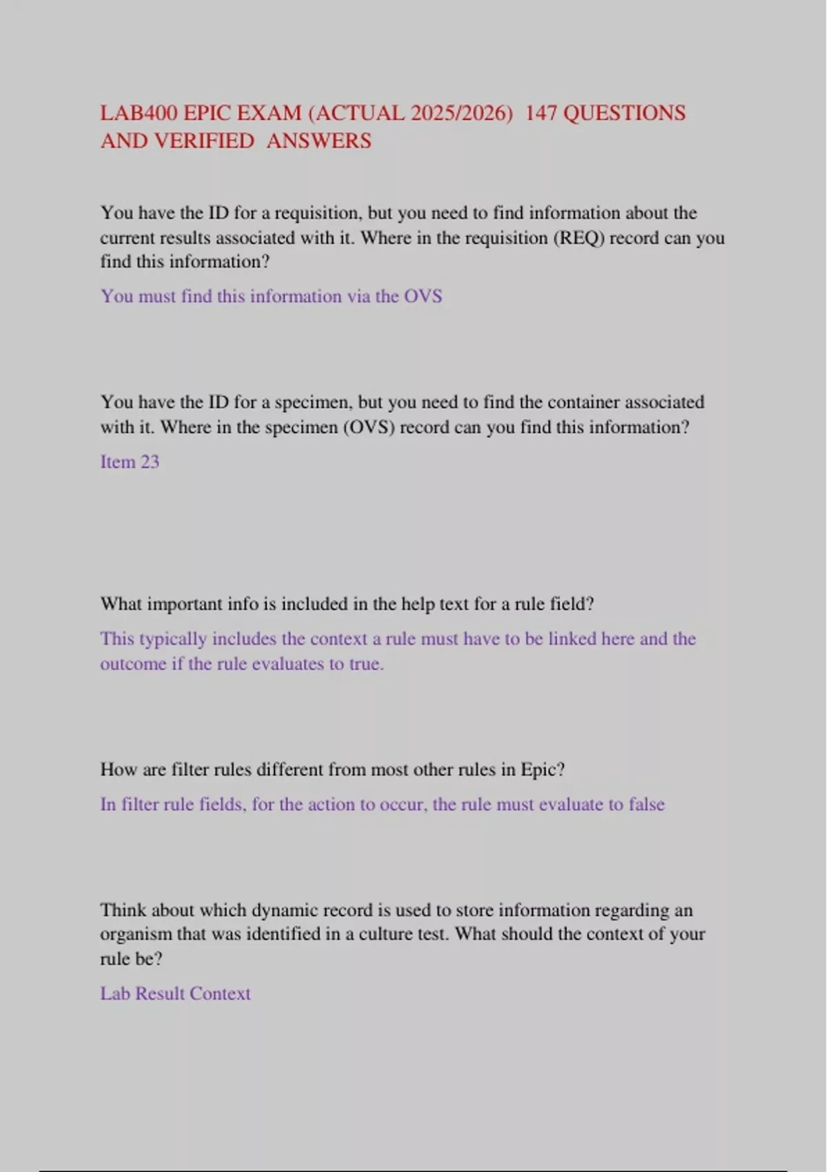 LAB400 EPIC EXAM (ACTUAL 2025/2026) 147 QUESTIONS AND VERIFIED ANSWERS