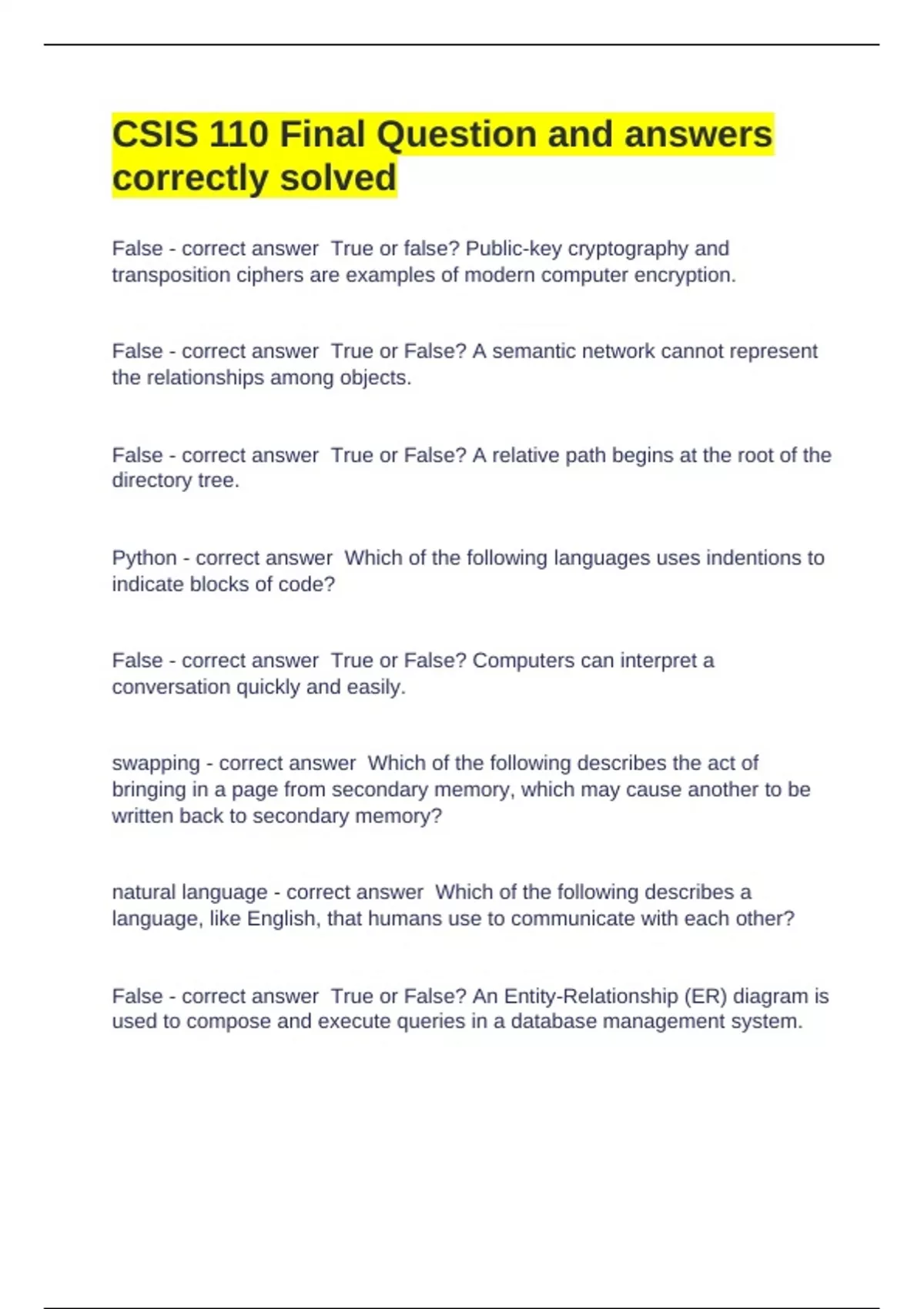 Liberty University - CSIS 110 CSIS 110 Final Question and answers correctly solved False - correct answer True or false? Public-key cryptography and transposition ciphers are examples of modern computer encryption. False - correct answer True or False? A semantic network cannot represent the relationships among objects. False - correct answer True or False? A relative path begins at the root of the directory tree. Python - correct answer Which of the following languages uses indentions to indicate blocks of code? False - correct answer True or False? Computers can interpret a conversation quickly and easily. swapping - correct answer Which of the following describes the act of bringing in a page from secondary memory, which may cause another to be written back to second