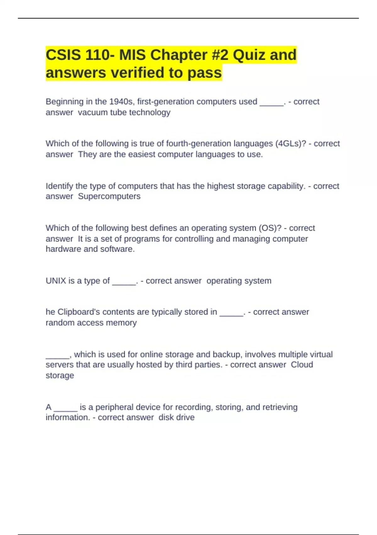 Beginning in the 1940s, first-generation computers used _____. - correct answer vacuum tube technology Which of the following is true of fourth-generation languages (4GLs)? - correct answer They are the easiest computer languages to use. Identify the type of computers that has the highest storage capability. - correct answer Supercomputers Which of the following best defines an operating system (OS)? - correct answer It is a set of programs for controlling and managing computer hardware and software. UNIX is a type of _____. - correct answer operating system he Clipboard's contents are typically stored in _____. - correct answer random access memory _____, which is used for online storage and backup, involves multiple virtual servers that are usually hosted by third parties. - correct answer Cloud storage